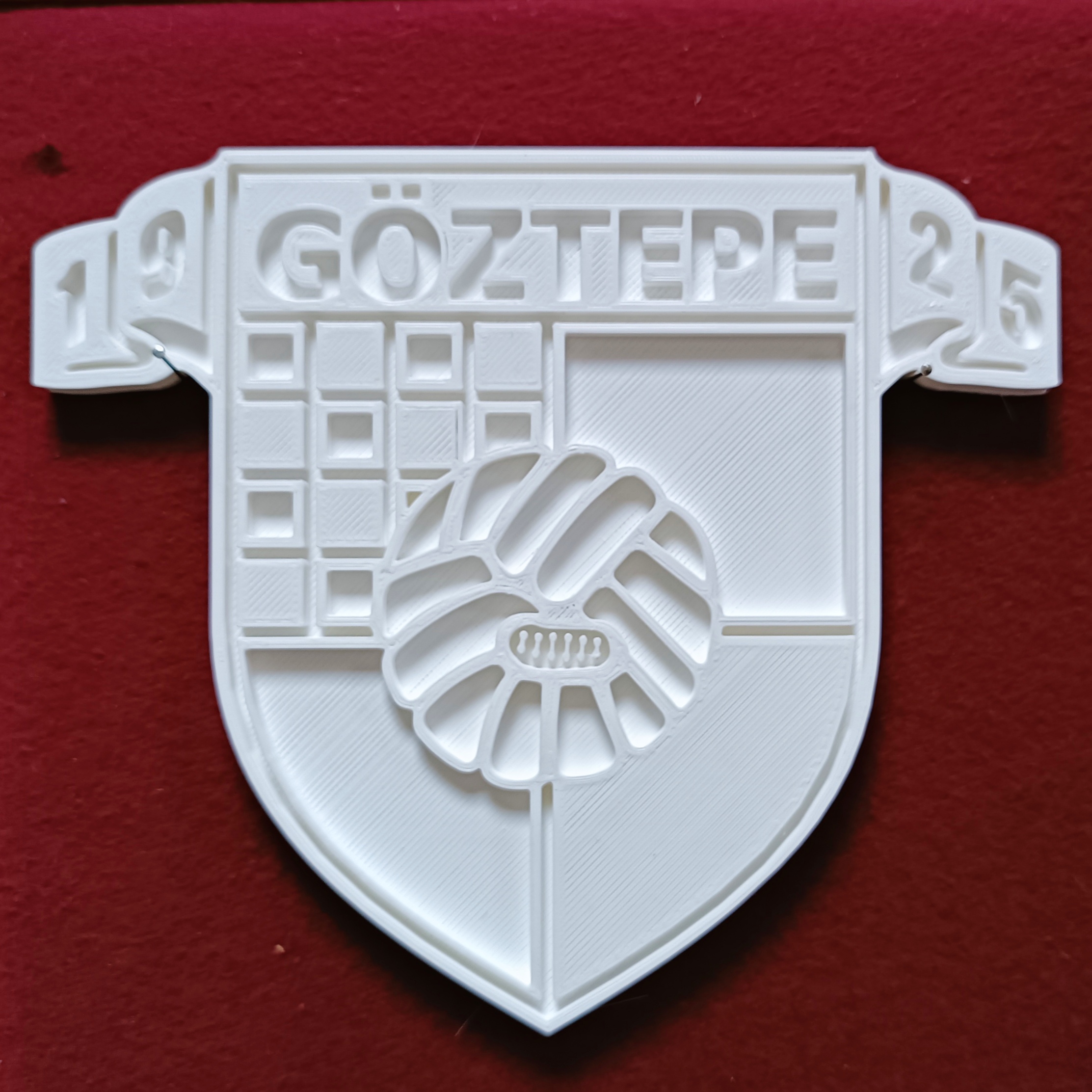 Logo Göztepe được xử lý bằng các phần mềm đồ họa 3D và tạo ra file .stl có thể in trực tiếp. Kết quả rất tốt khi in bằng PLA, với độ dày lớp in 0,2mm và 10% độ đầy.
