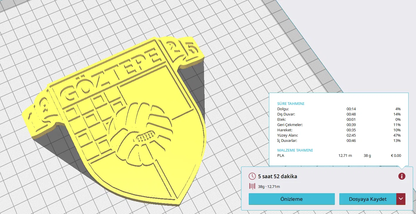 Logo Göztepe được xử lý bằng các phần mềm đồ họa 3D và tạo ra file .stl có thể in trực tiếp. Kết quả rất tốt khi in bằng PLA, với độ dày lớp in 0,2mm và 10% độ đầy.