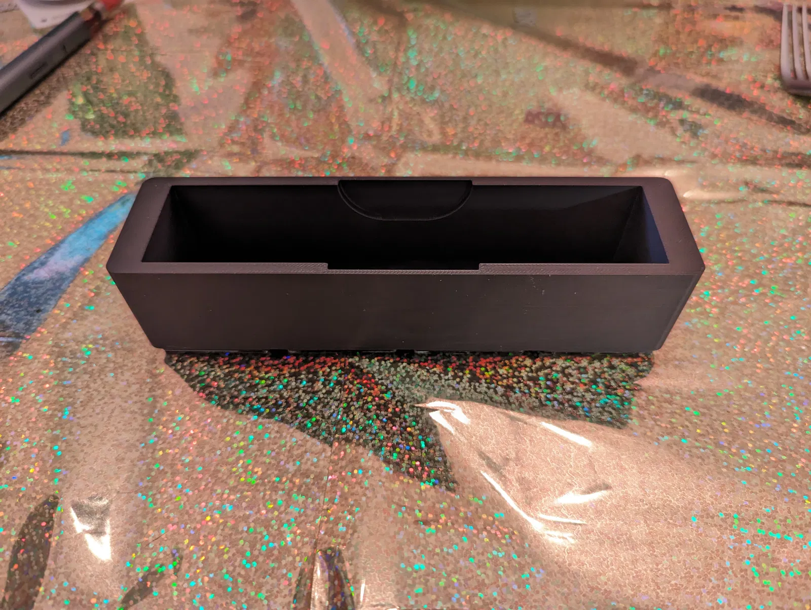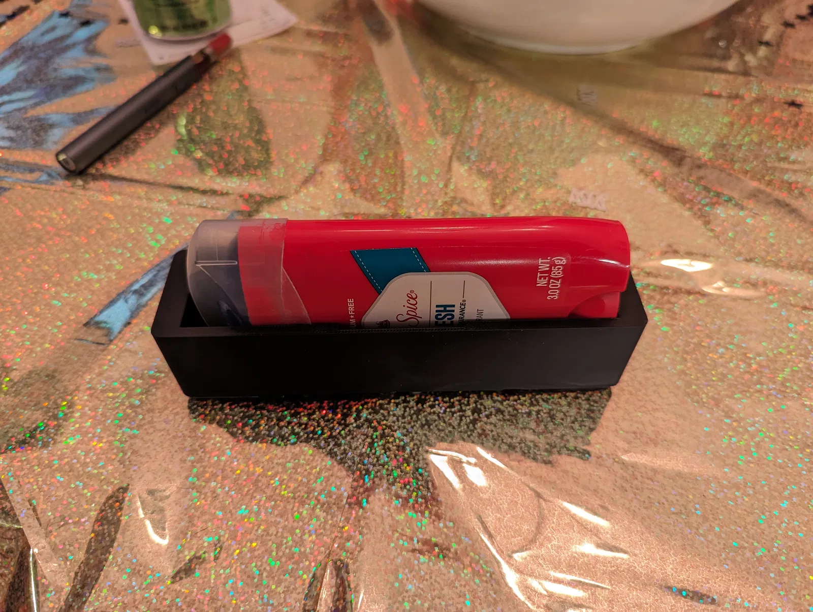 Một mẫu hộp đựng được thiết kế theo chuẩn Gridfinity, có thể để thỏi lăn khử mùi Old Spice nằm ngang. Mẫu này tuy có phần tì ngón tay hơi thừa nhưng vẫn giữ lại vì nó làm cho sản phẩm trông đẹp mắt hơn.