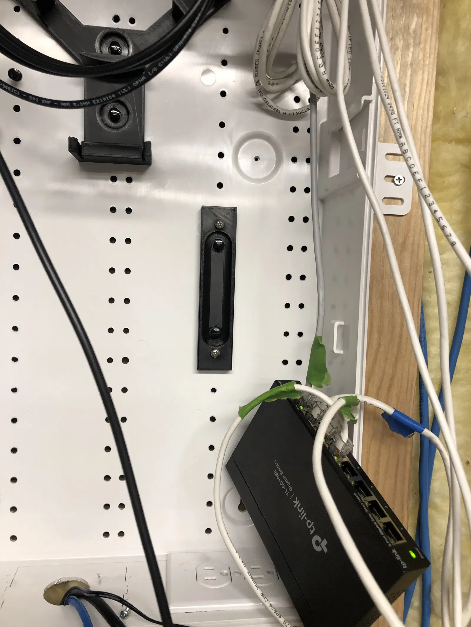 Một giá đỡ đơn giản có thể dùng để gắn một switch TP-Link TL-SG108E 8 cổng vào trung tâm truyền thông Leviton (Leviton structured media center). Cần 2 ghim gắn 47615-NYL và hai ốc vít đầu tròn #8. Hai con ốc #8 cách nhau 110mm nên có thể dùng cho các thiết bị khác có khoảng cách ốc vít tương tự.