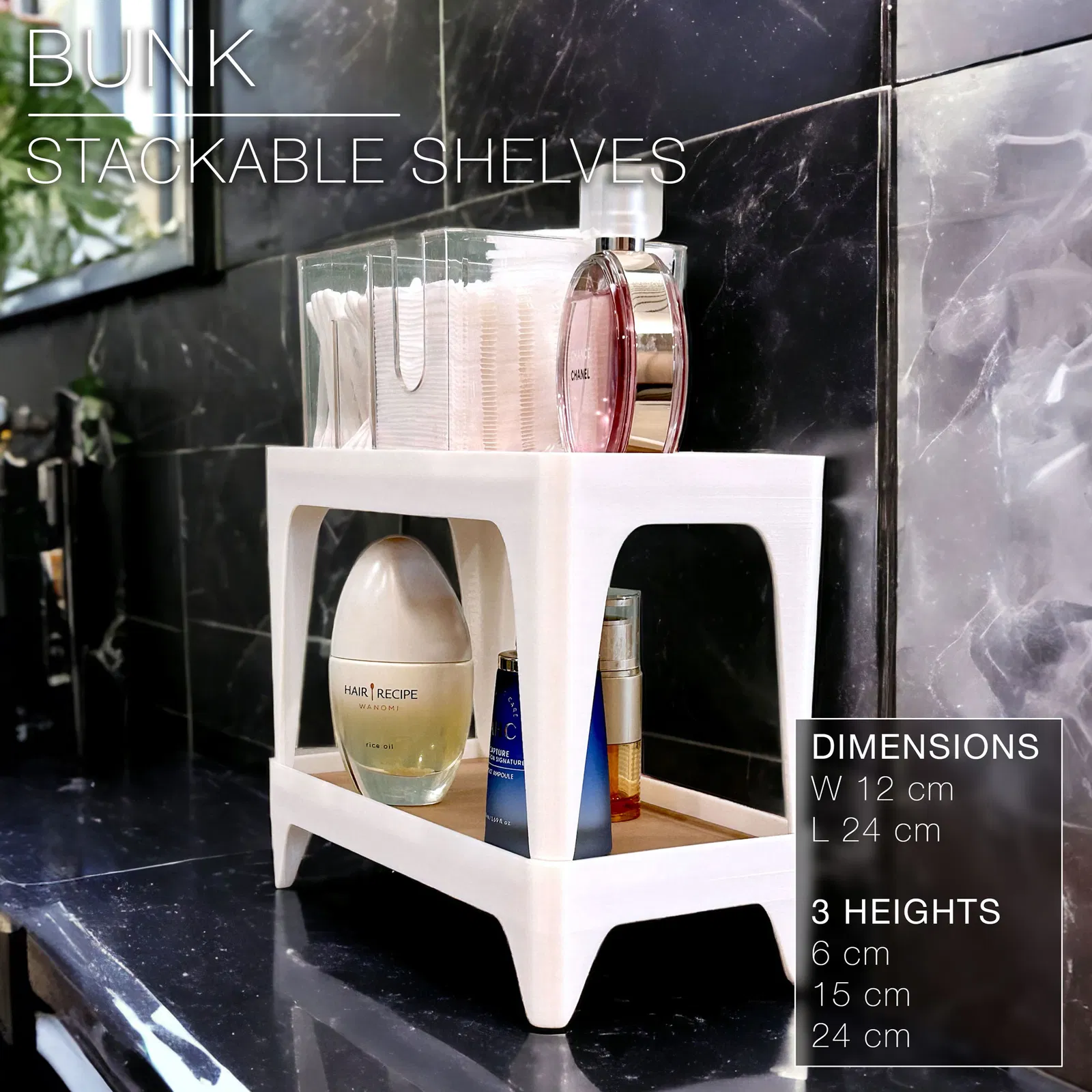 Kệ BUNK nhỏ gọn, có thể xếp chồng lên nhau, giúp bạn sắp xếp không gian nhà tắm hoặc bếp. In nhanh, không cần hỗ trợ. Có 3 kích cỡ chân đế và kệ riêng biệt để tùy chỉnh.