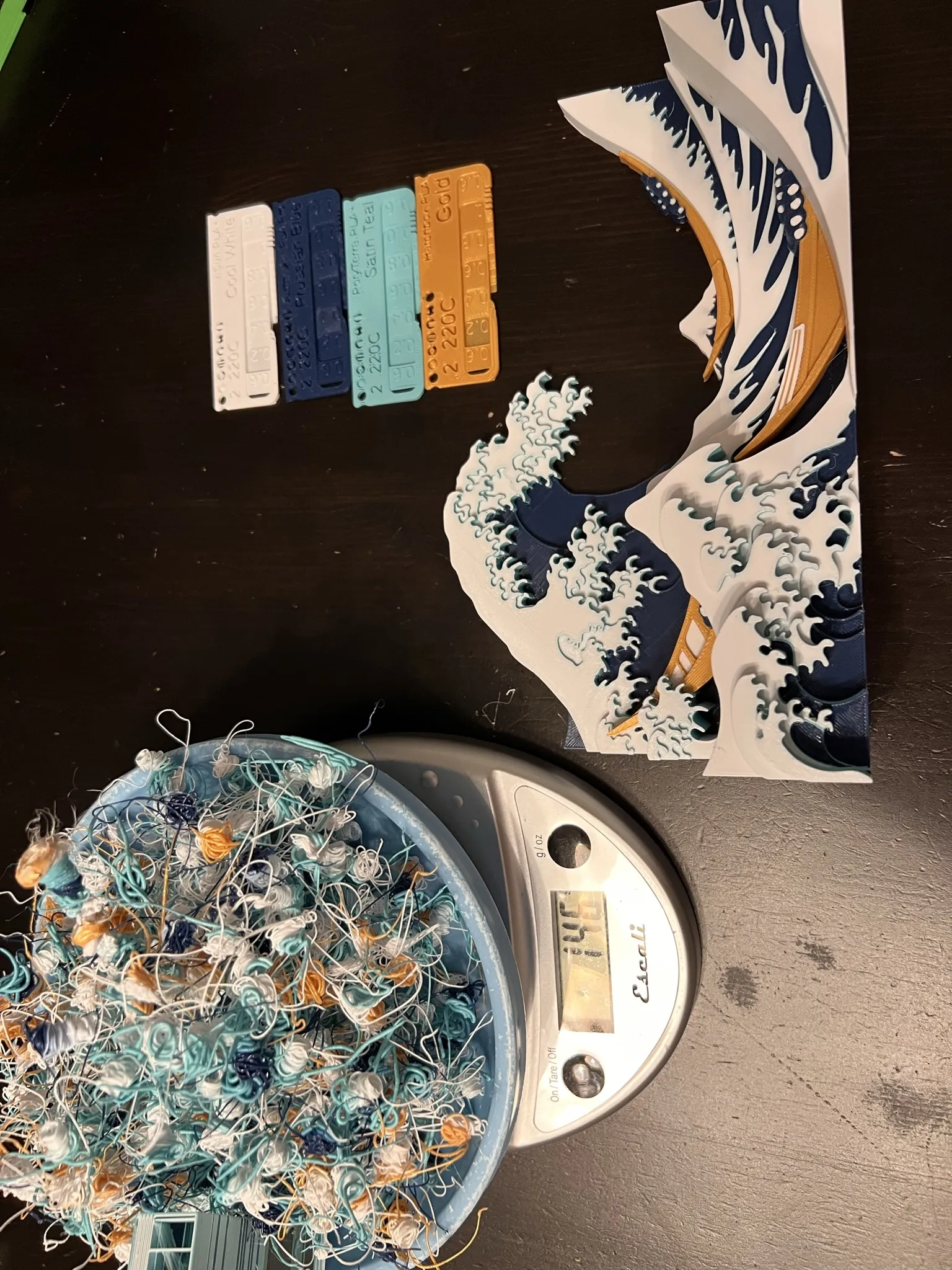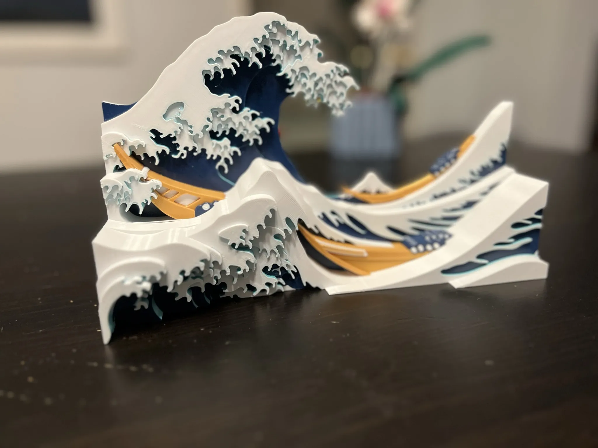 Đây được vẽ trong Bambu Slicer cho AMS với bốn màu. Thay vì chỉ vẽ mỗi lớp một màu khác nhau, tôi đã cố gắng khớp với bản in gốc càng nhiều càng tốt, bao gồm cả việc vẽ một số chi tiết trên một vài lớp. Tôi đã vẽ các cạnh của những con sóng màu xanh ngọc, và nó tạo ra một hiệu ứng rất đẹp.