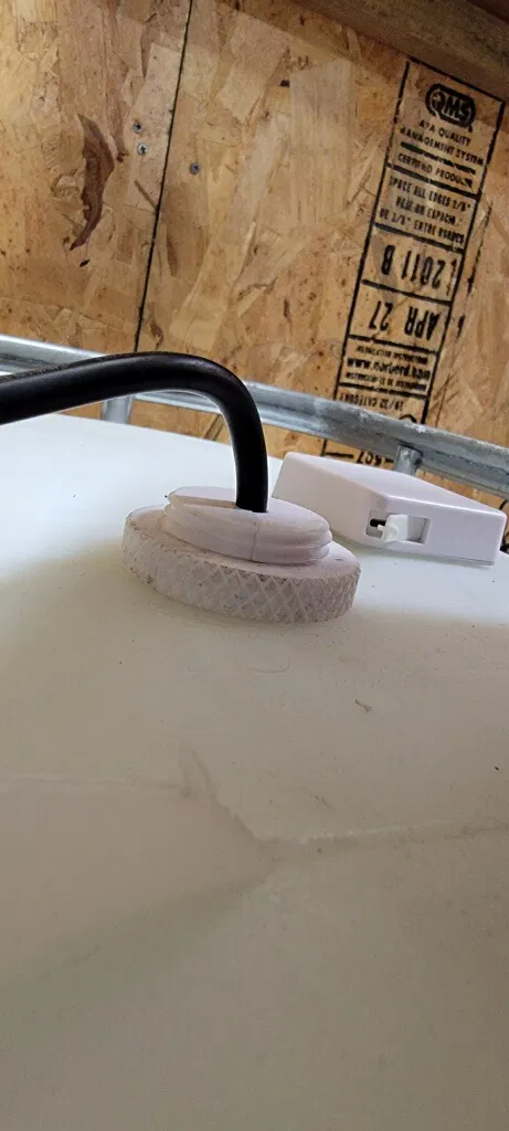 Một phần khác trong bộ sưu tập đồ dùng cho bể chứa nước của mình… cái này là dành cho thùng chứa nước mưa và bể chứa nước mưa trên đất của mình nha. Mình đã khoan lỗ trên nắp bể chứa và dùng cái này để có thể treo cảm biến nhiệt độ, bóng cảm ứng nhiệt cho aquastat, và một cái máy sưởi 1000w bằng dây điện của nó vào nước để giữ cho bể chứa không bị đóng băng.
