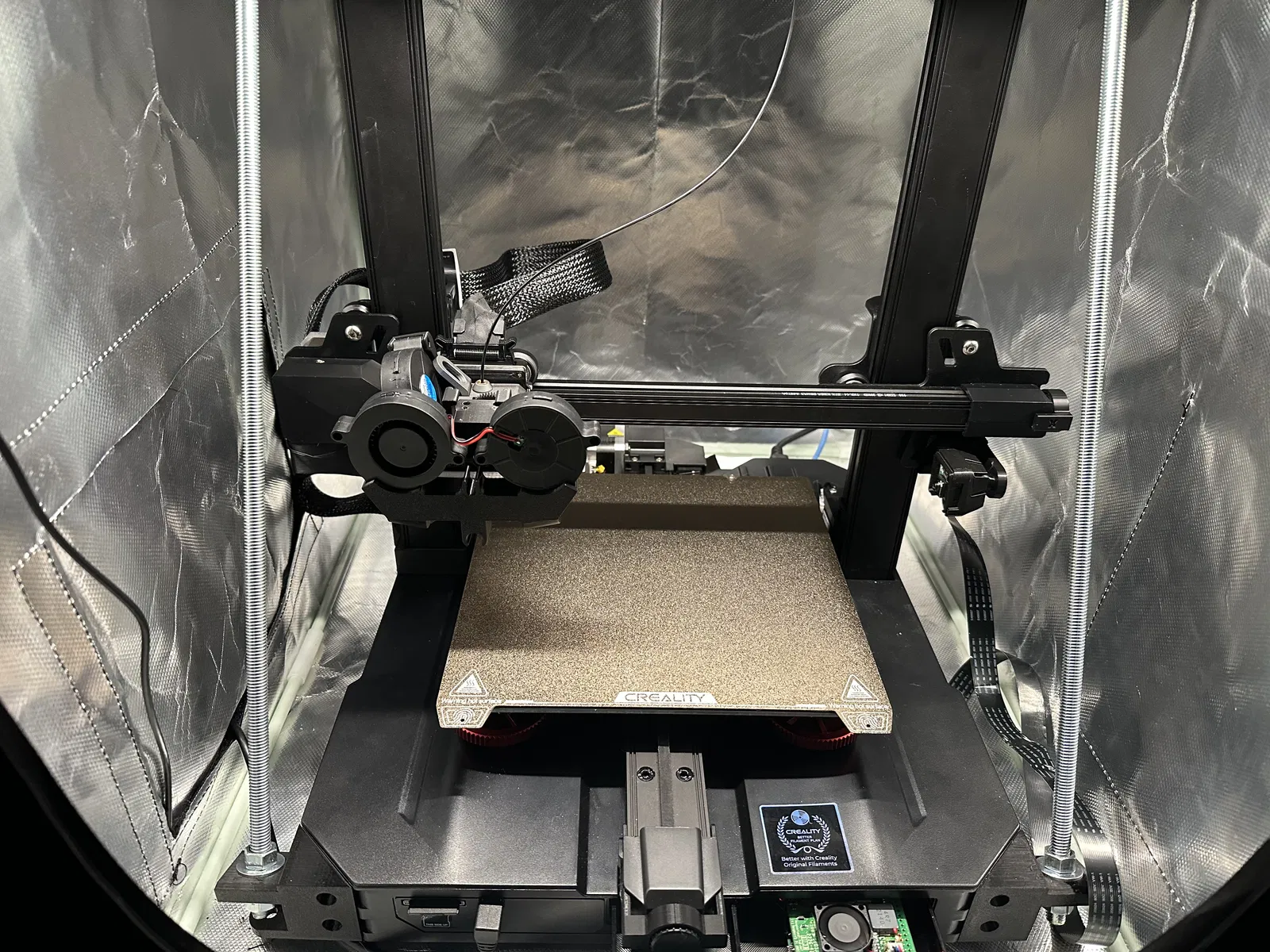 Độ đặc ruột (infill) vẫn nên đặt ở 25% với nhiều lớp tường. PLA và PETG đều có thể dùng được nếu không dùng buồng in gia nhiệt chủ động. Các vỏ máy tiêu chuẩn không nên gây vấn đề với PLA bị biến dạng. Nếu dùng buồng in gia nhiệt chủ động, nên dùng PETG, ASA, hoặc ABS.