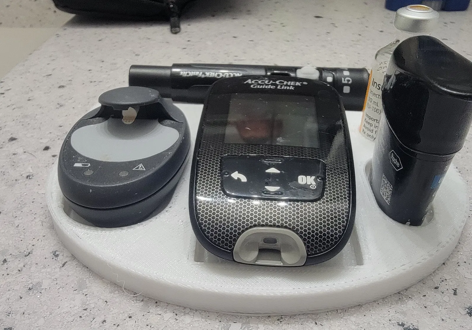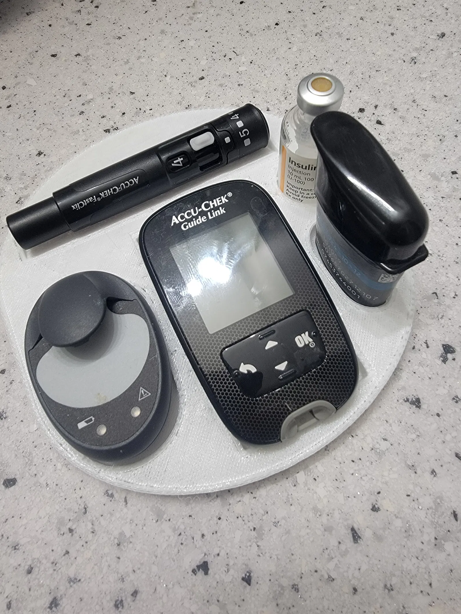 Đây là một cái khay để cất giữ đồ dùng cho người bị tiểu đường của bạn trong phòng tắm hoặc bất cứ nơi nào bạn hay để chúng. Nó được thiết kế để đựng Máy đo đường huyết Guide Link, Dụng cụ lấy máu, que thử, Sạc Medtronic CGM và một chai insulin.