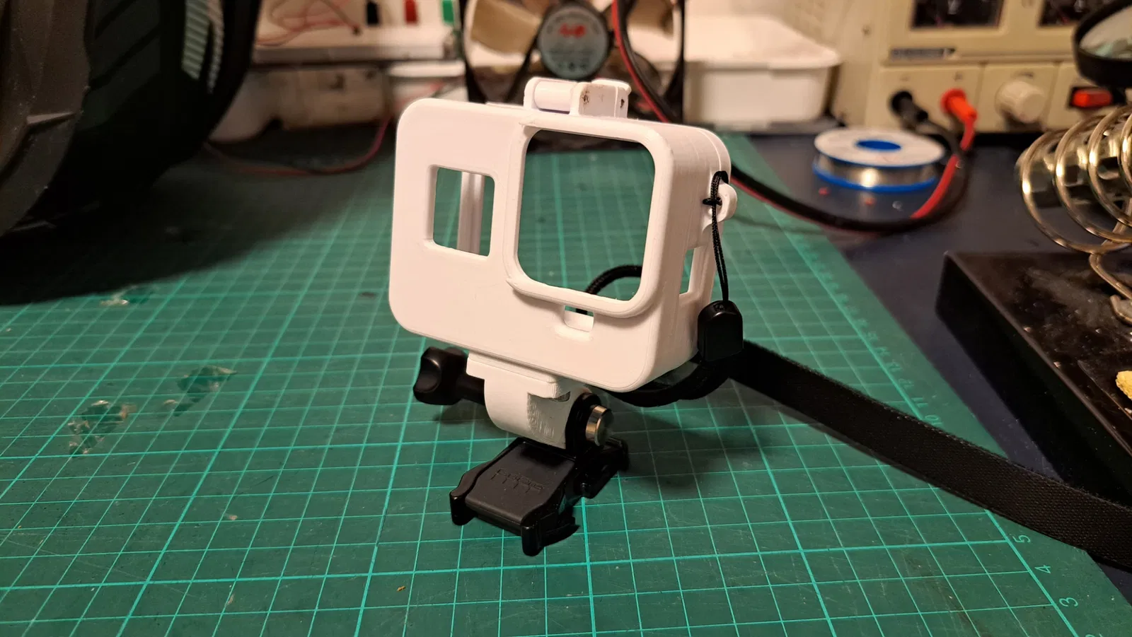Chiếc ốp lưng bảo vệ đơn giản này dành cho GoPro 8 Black, có khe cắm vừa miếng bảo vệ ống kính acrylic, giúp thay pin dễ dàng mà không cần tháo máy. Phần adapter gắn có thể in nghiêng để tăng độ chắc chắn.