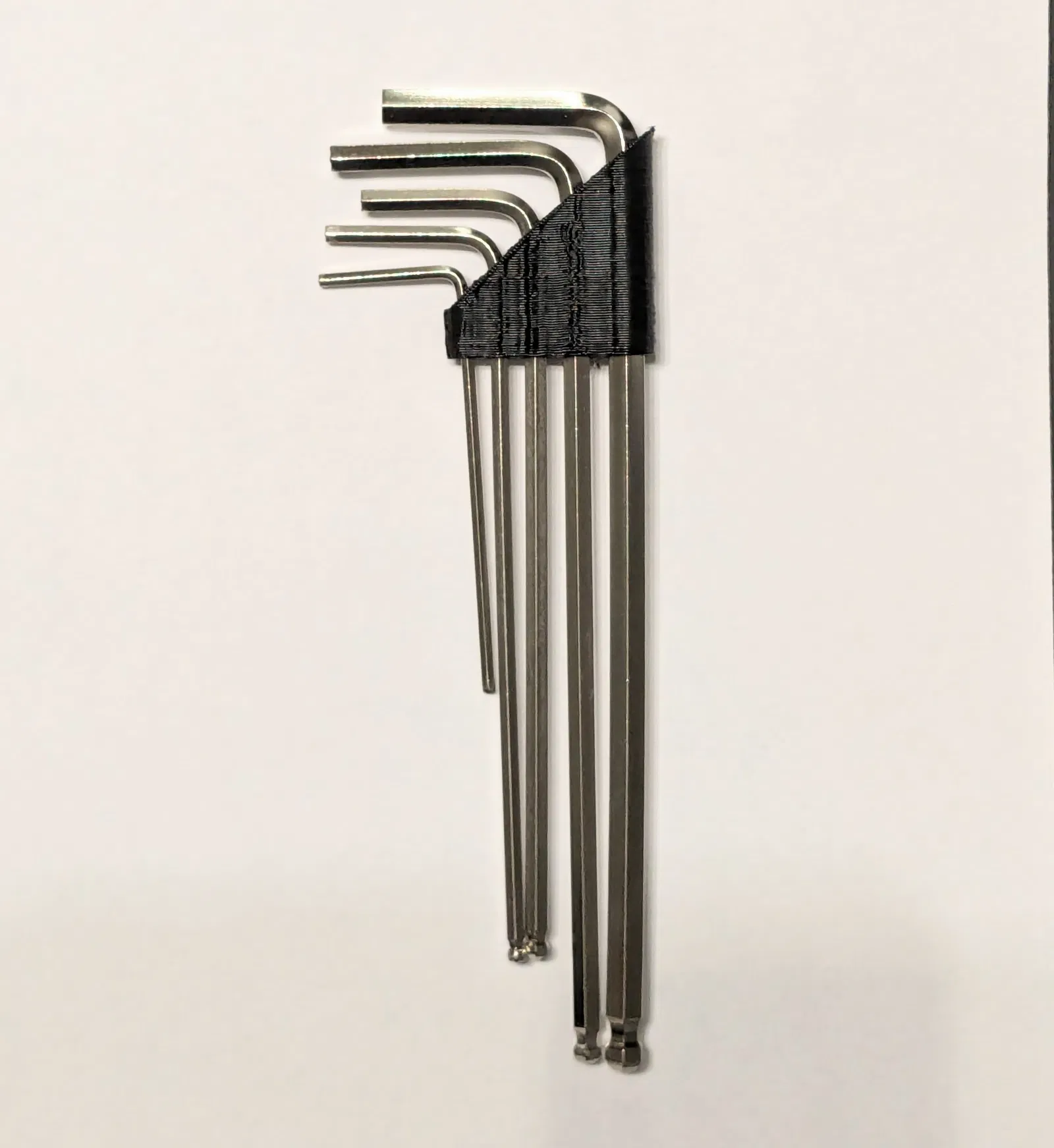 Kệ đựng lục giác cho Ender 3. Cái kệ này được làm ra để đựng các cây lục giác đi kèm với máy Ender 3. Phiên bản cập nhật có thêm lỗ cho cây lục giác 1.5mm.