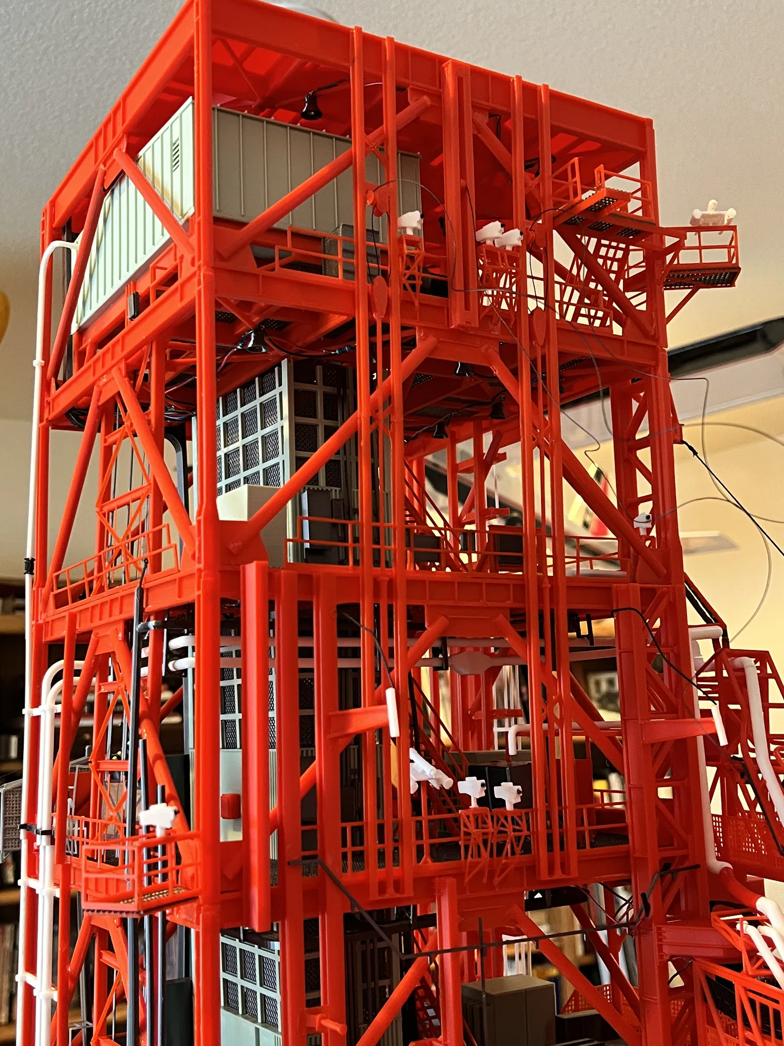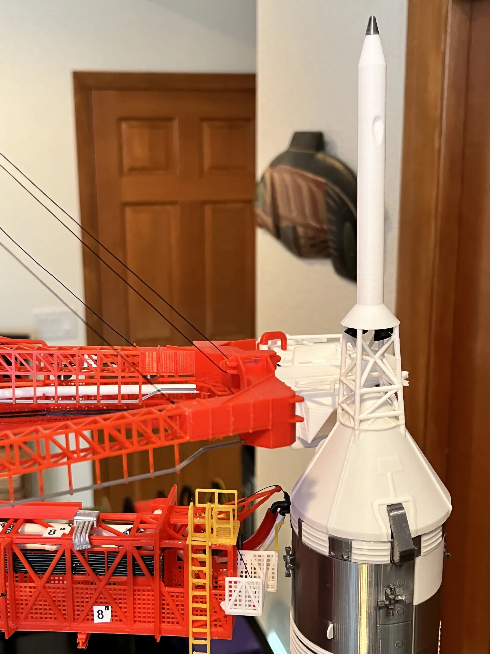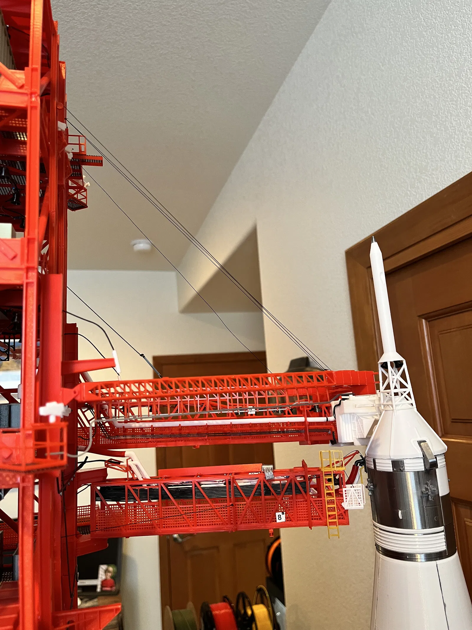 Cái này gồm có cánh tay DRRS để giữ cho tên lửa Saturn V ổn định. Đây là một phần của mô hình Tháp Rốn Apollo lớn hơn.