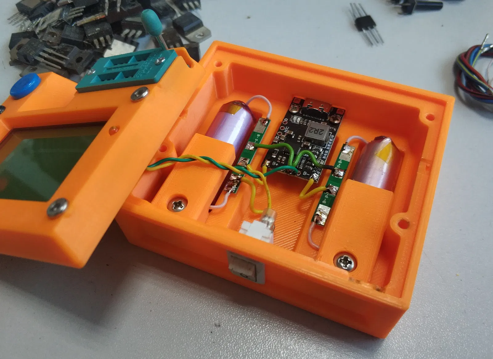 Quân đoàn cho máy kiểm tra bóng bán dẫn LCR-T4. Kích thước tối thiểu, độ cứng tốt. Hai tùy chọn để thực hiện phần dưới: cho hai ô 14400 với mô-đun char USB-C và hộp trống, trong đó 1-3.14500, 1-2 18650 hoặc pin 9V tiêu chuẩn sẽ phù hợp.
