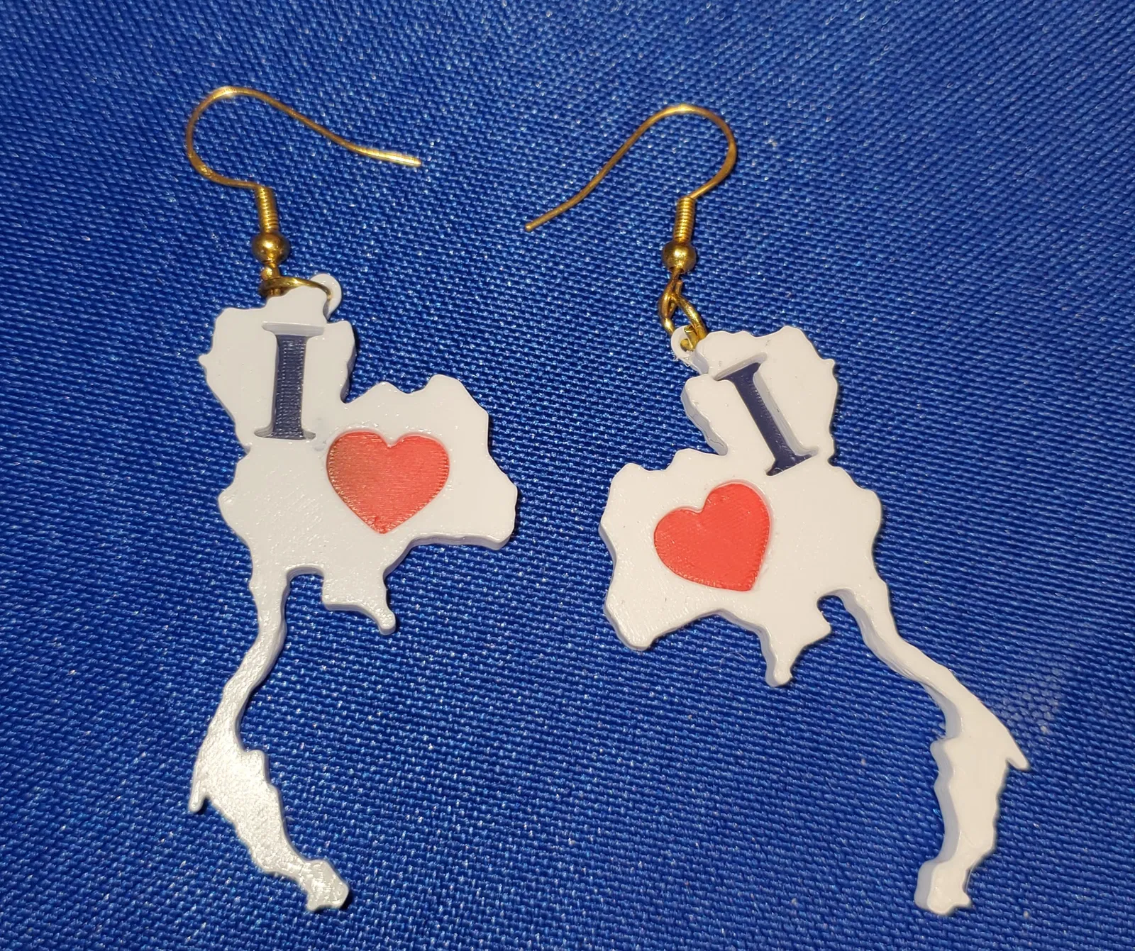 Chữ 'I', biểu tượng (<3) và bề mặt đất nước đều có các độ cao khác nhau để bạn có thể tùy chỉnh màu sắc thủ công nếu muốn! Thông thường, mình hay làm phần đất nước màu trắng, chữ 'I' màu xanh dương và biểu tượng '<3' màu đỏ. Nhân tiện, màu cờ Thái Lan giống Mỹ nha, đều là đỏ, trắng, xanh dương đó. Vợ mình người Thái thích mấy cái này lắm, cứ bắt mình in hoài cho bạn bè cổ luôn. Bạn có thể mua bộ phụ kiện bông tai giá rẻ trên Amazon để làm phần cứng nha.