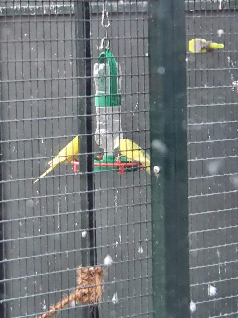Chén uống nước cho chim có đế và chỗ giữ bình. Bình là loại chai PET 0.7L nước lọc mua ở siêu thị (ví dụ: ALDI)