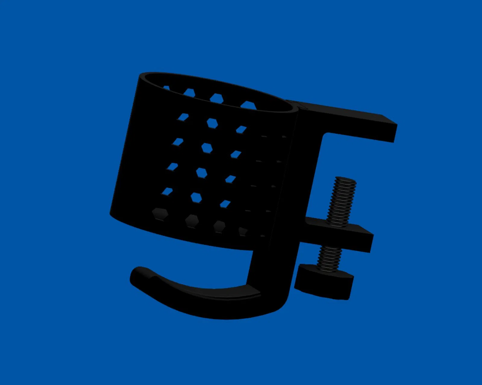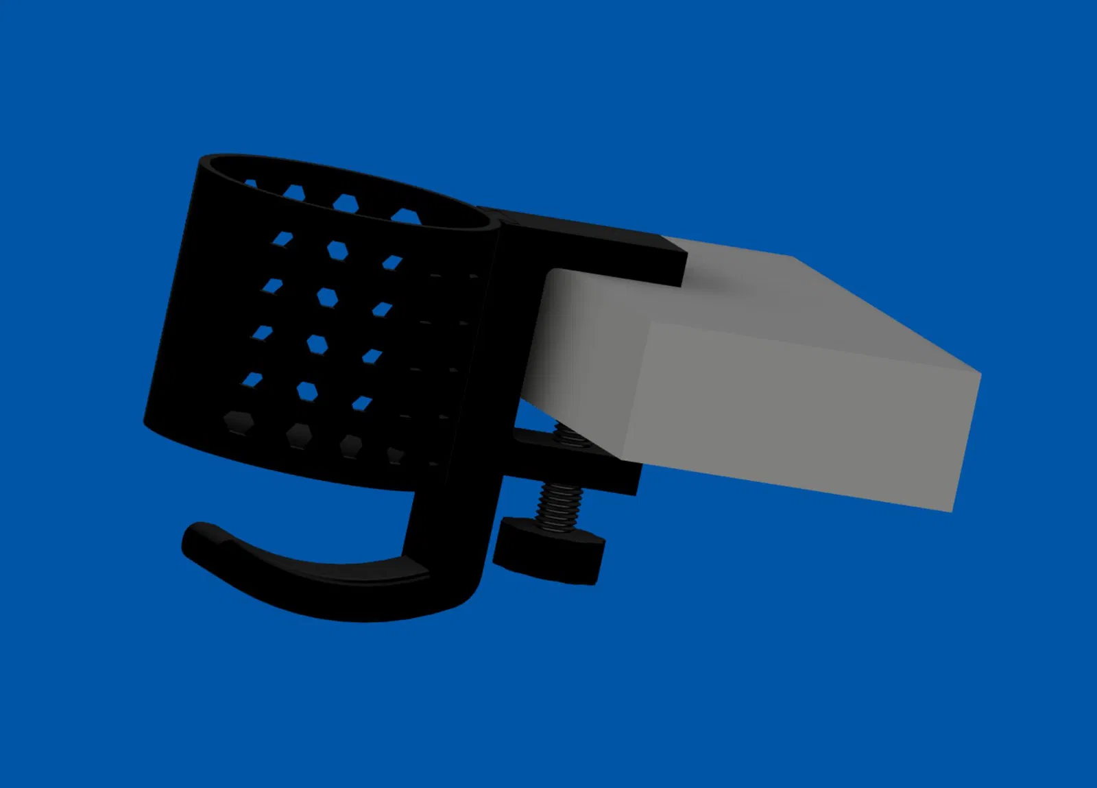 Giá đỡ chai nước/cốc này kẹp vào cạnh bàn thông qua một kẹp "C" tích hợp. Giá đỡ chịu được các vật chứa đồ uống có đường kính lên đến 80mm và giữ ổn định các vật chứa có đường kính lên đến 75mm. Kẹp có thể điều chỉnh cho độ dày cạnh bàn lên đến 50mm. Bu lông kẹp "C" là loại M12x1.75mm. Tôi đã chia sẻ các tệp in cho hai độ dài bu lông để phù hợp với các cạnh bàn dày và mỏng.