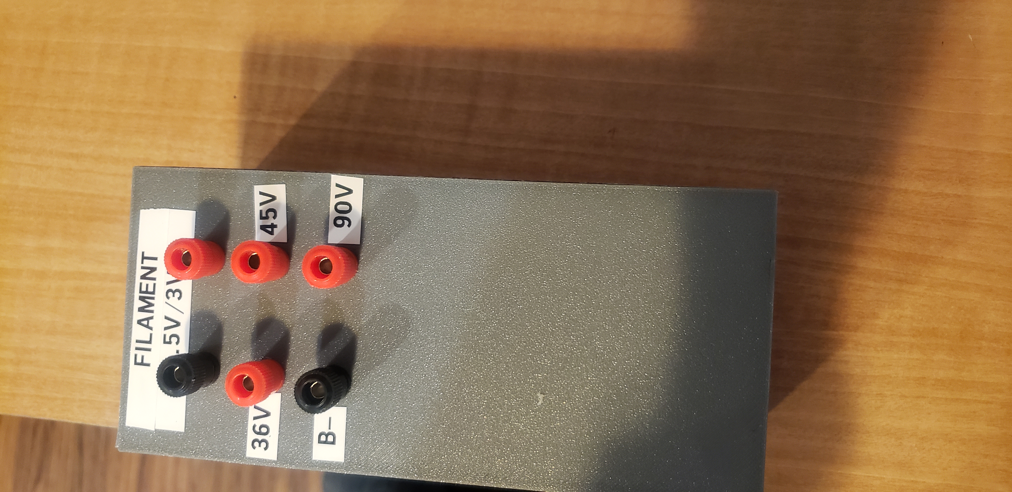 Nắp hộp có lỗ để gắn 6 cái jack chuối. Hai cái dùng cho nguồn filament và bốn cái dùng để cung cấp các mức điện áp B+ khác nhau. Chỉ cần nối jack vào điểm thích hợp trong chuỗi pin 9V.