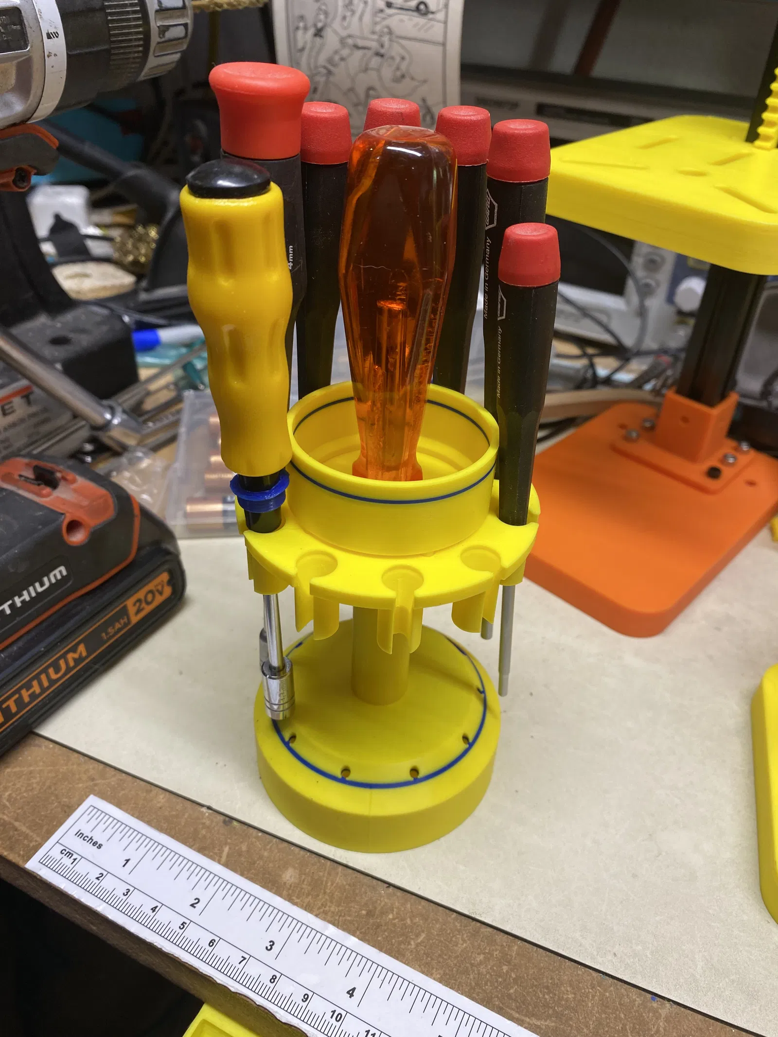 Vứt mấy cái tua vít cỡ nhỏ lộn xộn trong ngăn kéo đi! Giờ thì chúng luôn sẵn sàng, dễ lấy. Chỉ cần in 3-4 bộ phận, có thể thêm vòng bi để xoay tiện lợi. Thiết kế thông minh giữ tua vít thẳng đứng, dễ cầm, đáy có lỗ đựng đồ nhỏ khác.