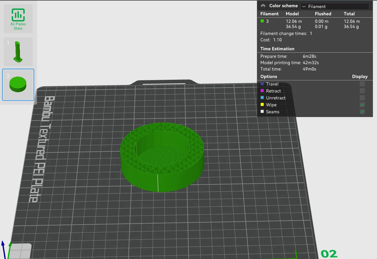 Tui có dùng kích thước chuẩn của nó và in với tùy chọn "fuzzy skin" (khoảng cách chấm 0.6 và độ dày 0.3) để mấy cạnh nó có độ bám ngon lành.