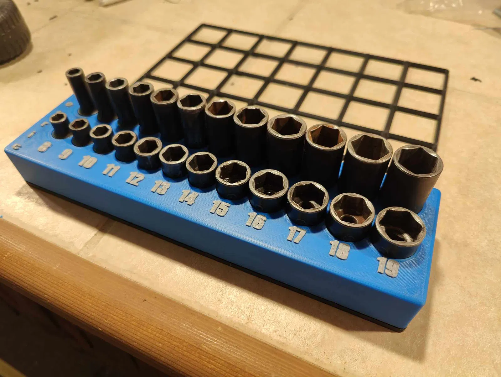 Kệ giữ tuýp này được thiết kế riêng cho các tuýp Matco ADV, vốn dày hơn các loại thông thường. Nếu bạn cũng gặp khó khăn trong việc tìm kiếm kệ phù hợp, thì đây là giải pháp dành cho bạn. Khay được in theo chuẩn Gridfinity 7x2, đảm bảo sự gọn gàng và dễ dàng truy cập các kích cỡ tuýp từ 8mm đến 19mm.