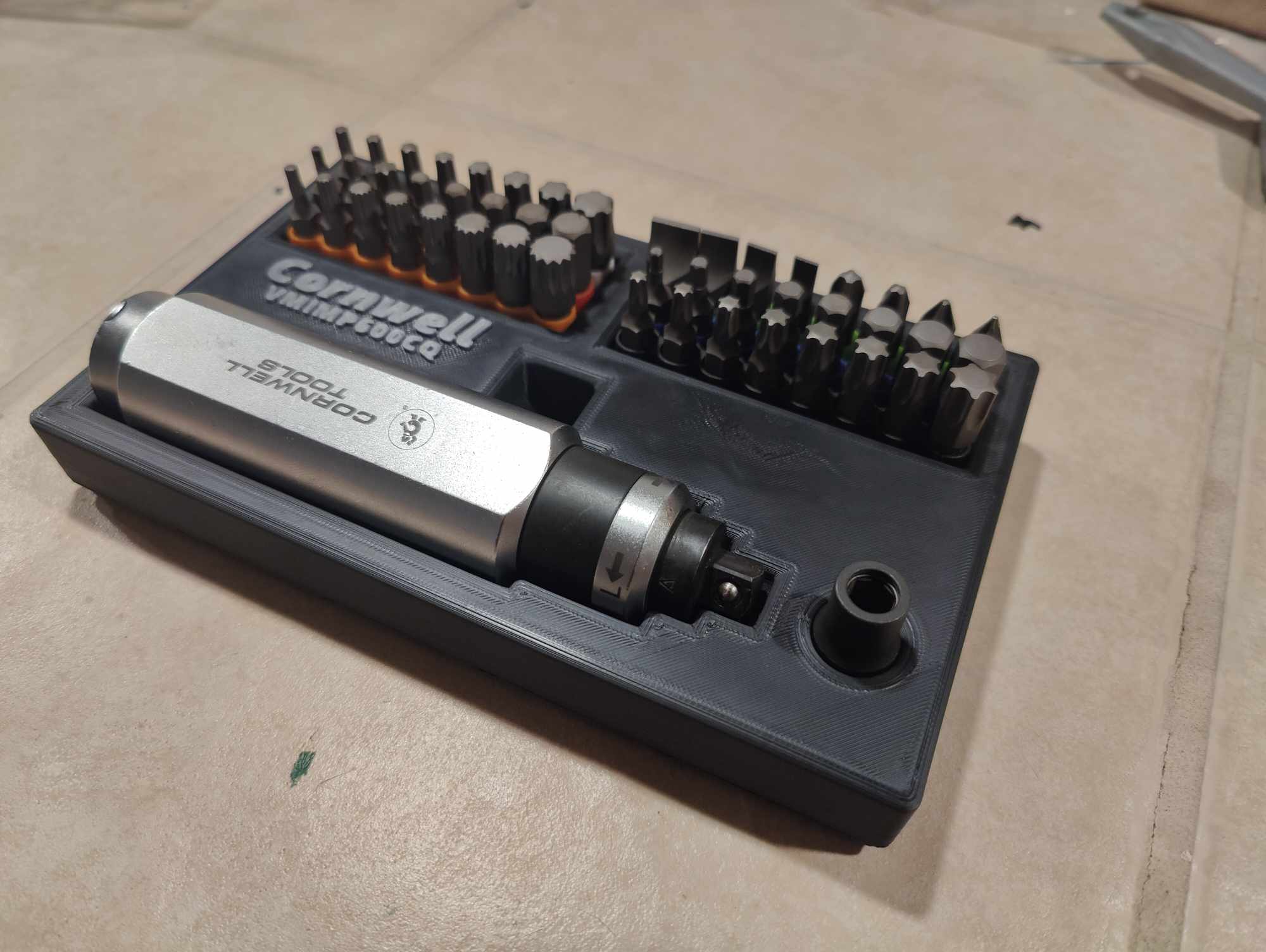 Mô hình này được thiết kế cho tua vít tác động dùng tay Cornwell và có thể dùng với các loại khác. Bao gồm 2 file STL, có và không có chữ. In bằng PLA, tốn 141.48g filament và mất 5h6m.
