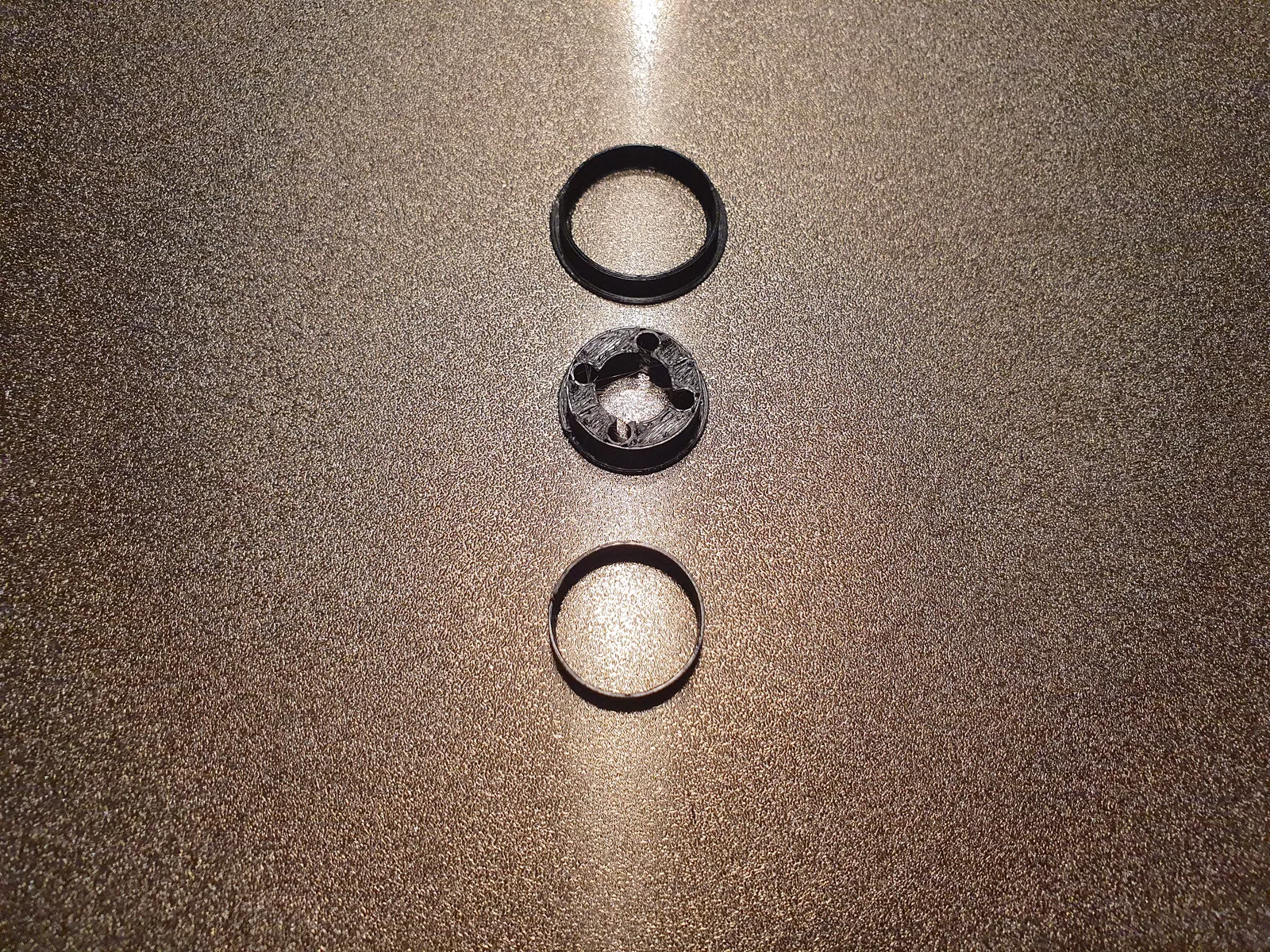 Đầu tiên dán nam châm vào lỗ nắp (ấn chúng vào), đặt hai nửa nắp lên thanh trục và di chuyển nắp lên cho đến khi chúng gắn vào bạc đạn của bàn in. Sau đó dán vòng chia thành hai nửa nắp. Cuối cùng ấn nắp xuống bằng vòng ngoài và ấn nó vào các lỗ trục z.