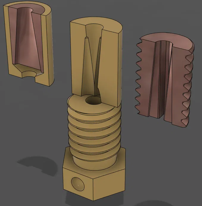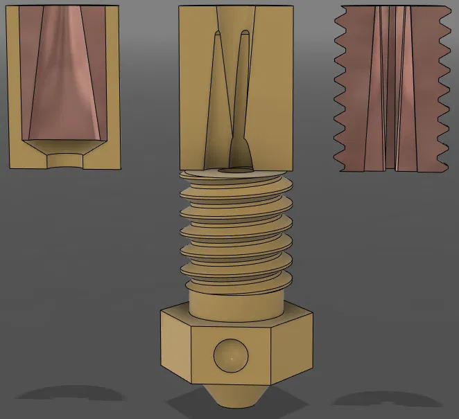 Để hỗ trợ sản xuất, thiết kế này gồm 2 lát đồng hình gương có thể ép vào bộ chuyển đổi, giống như lõi đồng của đầu phun CHT Aliexpress. Đây có lẽ vẫn là cái khó sản xuất nhất, nhưng có thể làm bằng máy tiện và một chút thời gian quyết tâm với máy Dremel để khắc phần trung tâm ống bóp.