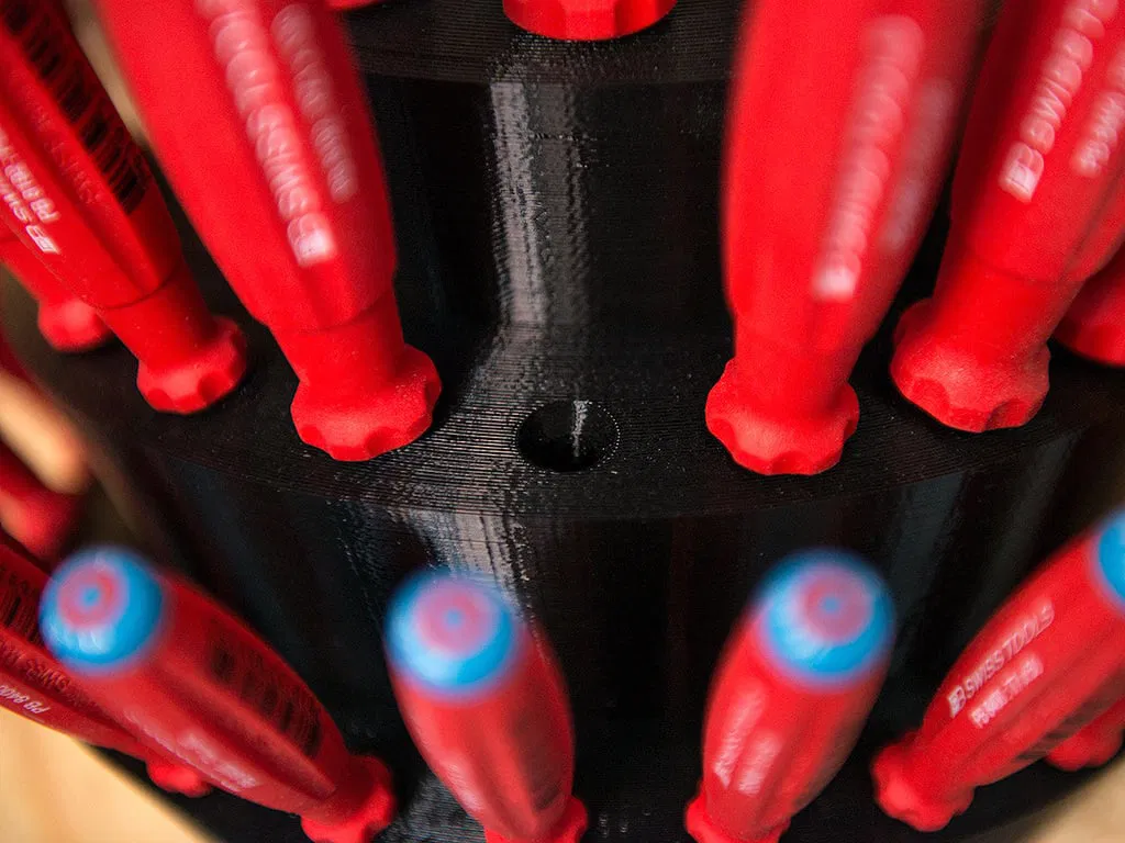 Các lỗ xuyên suốt đáy, vì vậy những cái tuốc nơ vít dài hơn sẽ chỉ nhô ra một chút, và tay cầm sẽ nằm gọn gàng và chắc chắn ở cùng một cấp độ.