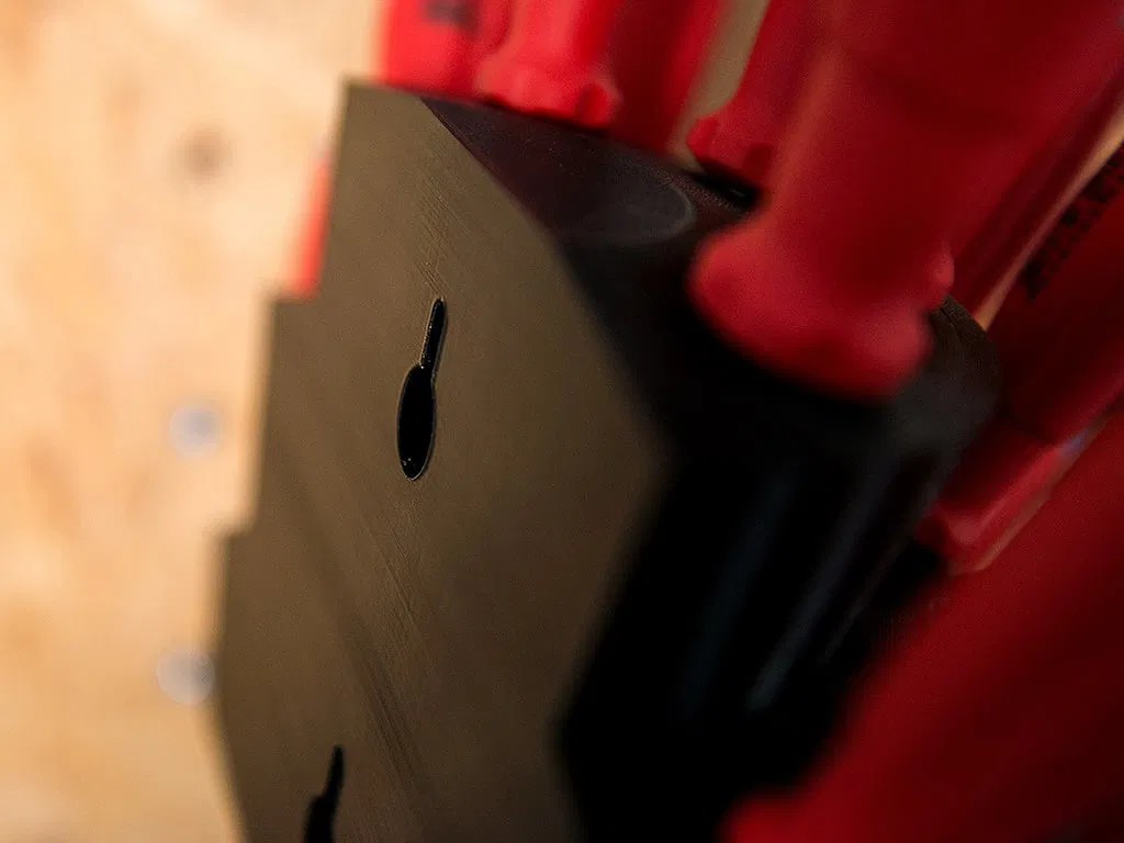 Có hai khe ở mặt sau để gắn nó lên tường bằng hai con vít, để nó không bị xoay khi lấy hoặc trả dụng cụ.