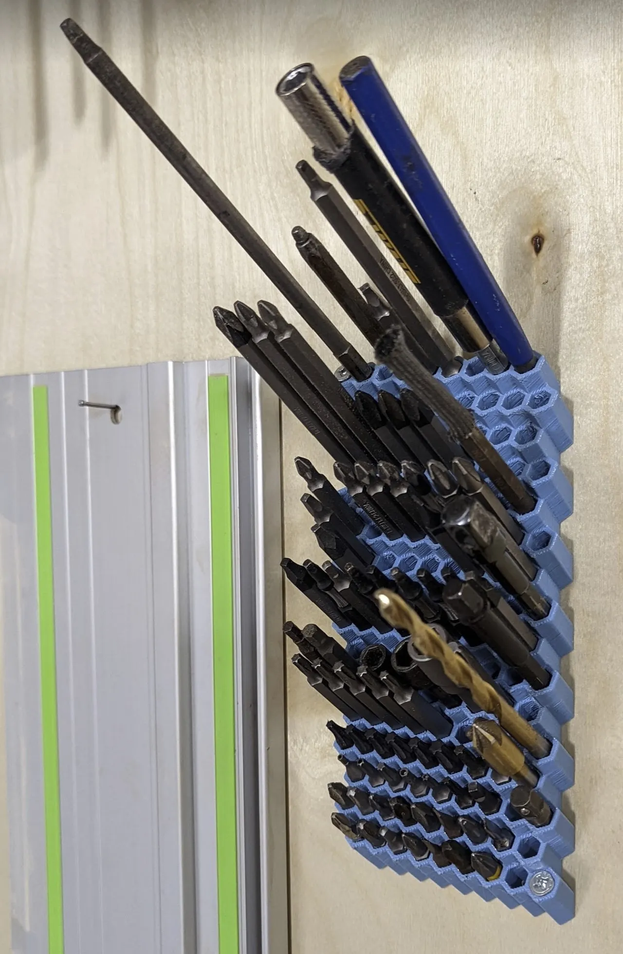 Giá đỡ bit tuốc nơ vít hình tổ ong. Giữ các bit ở một góc. Dễ dàng vặn vít lên bề mặt thẳng đứng.