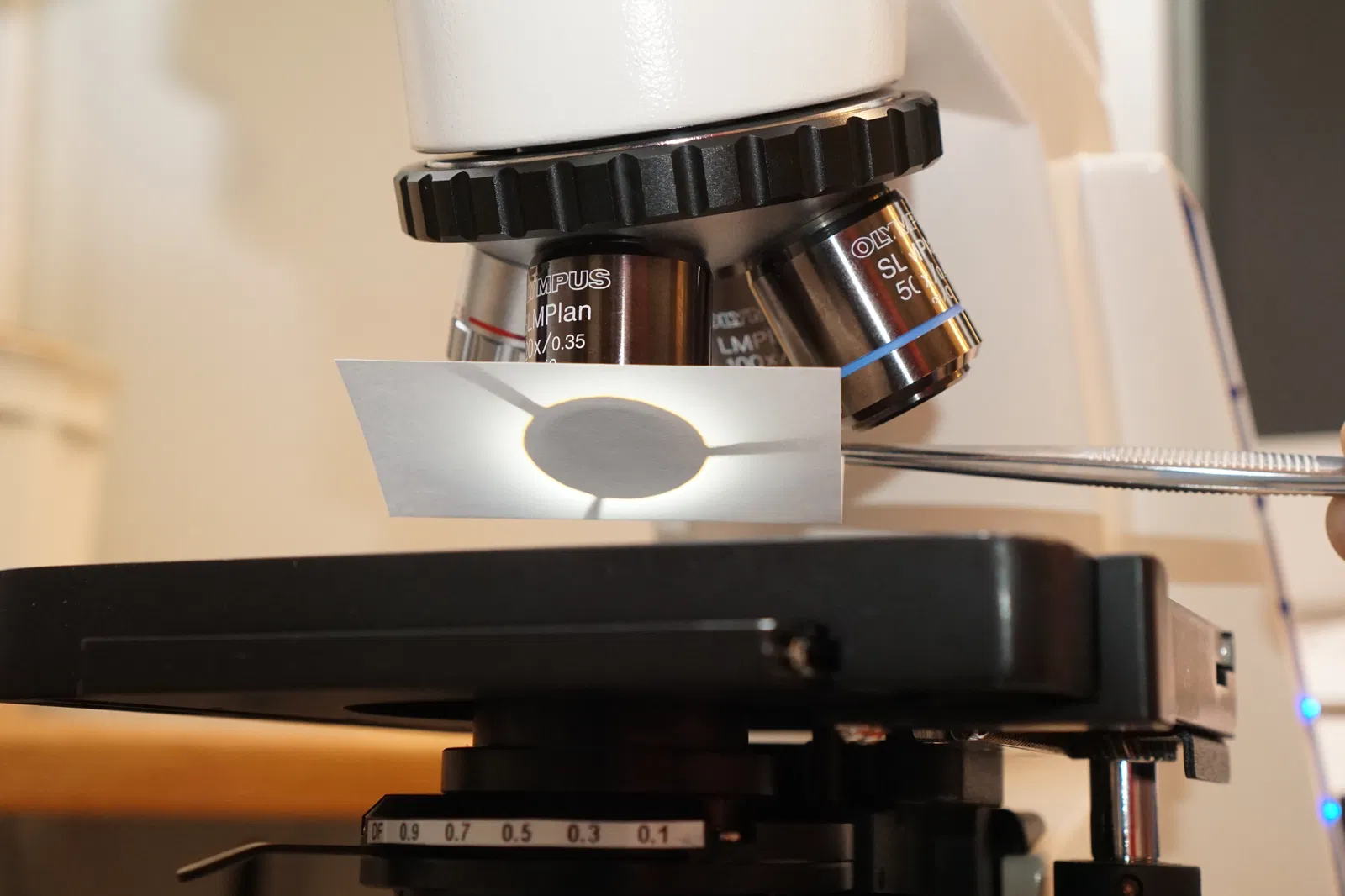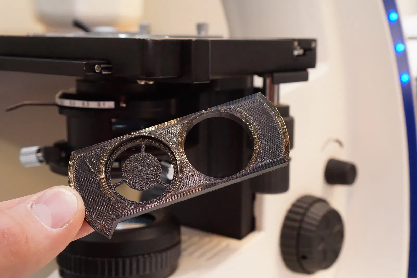 Nểu bạn bị mất cái thanh trượt filter cho kính hiển vi Zeiss Primo Star của mình, thì đây là cách đơn giản để thêm khả năng dark-field cho kính hiển vi. Chỉ cần thay thế thanh trượt rỗng và lắp bộ lọc màu hoặc stop dark-field có kích thước phù hợp. Các vật kính có NA cao hơn sẽ cần stop lớn hơn và mình có kèm theo các stop với kích thước khác nhau (nói cho mình biết nếu bạn cần kích thước khác nha). Thay đổi nhanh giữa chế độ dark-/bright-field bằng cách di chuyển thanh trượt một nấc và nhớ mở hoàn toàn khẩu độ khi ở chế độ dark-field. Di chuyển thanh trượt ra khỏi vị trí giữa sẽ cho bạn chiếu sáng xiên.