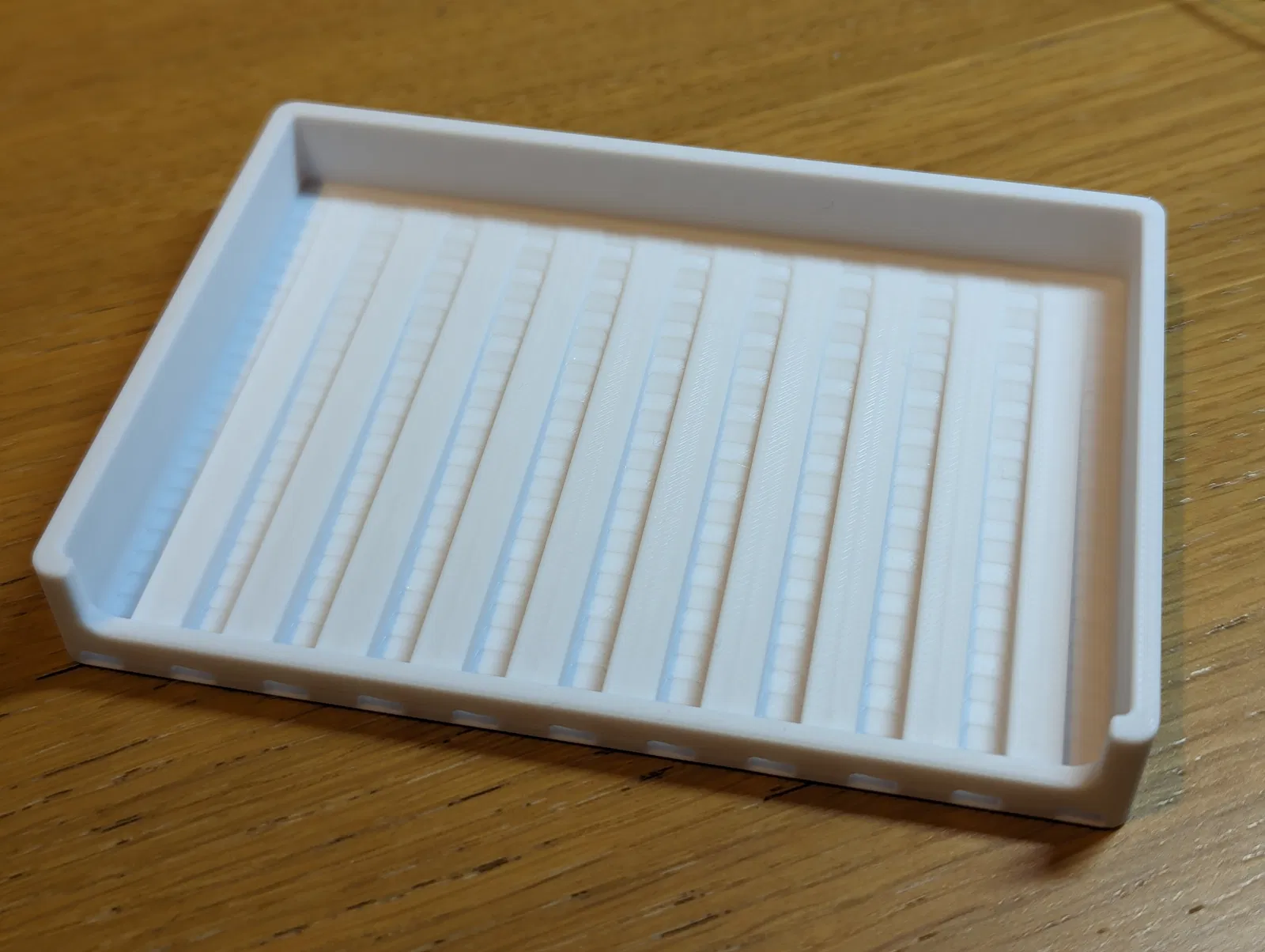 Dĩa xà bông có lỗ thoát nước và các rãnh dốc để nước chảy ra ngoài.