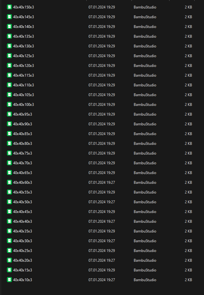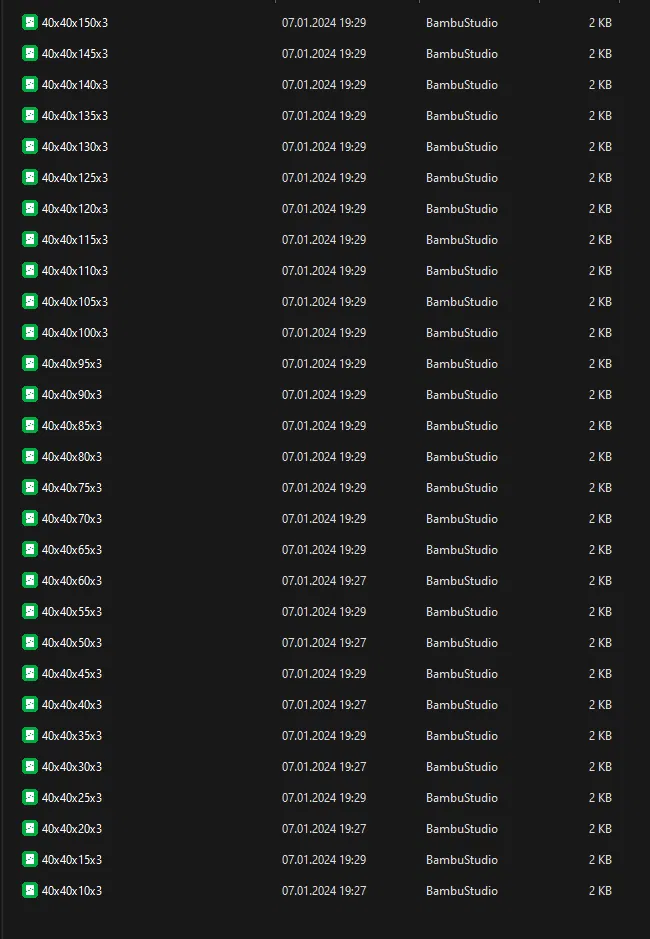 Kích thước tùy chỉnh cho mọi nhu cầu Các hộp của tôi có nhiều kích cỡ khác nhau để phù hợp với các nhu cầu khác nhau. Chúng có sẵn từ kích thước nhỏ gọn 40x40x10 mm đến kích thước lớn hơn 150x150x150 mm. Các hộp này được cung cấp với gia số 5mm, cho phép lựa chọn kích thước chính xác. Kích thước được liệt kê là bên ngoài của hộp. Để tìm kích thước bên trong, hãy trừ hai lần độ dày thành hộp khỏi chiều dài và chiều rộng. Đối với chiều cao, chỉ cần trừ một lần độ dày thành hộp. Tìm hộp bạn cần Do có nhiều loại hộp, tôi đã sắp xếp các hộp có cùng kích thước đế nhưng chiều cao khác nhau (lên đến 150mm) vào các thư mục riêng để dễ dàng truy cập. Mỗi thư mục được gắn nhãn với kích thước Chiều rộng X Chiều dài. Để xác định vị trí thư mục phù hợp, bạn có thể chỉ cần tìm giá trị nhỏ hơn, là Chiều rộng hoặc Chiều dài, phù hợp với nhu cầu của bạn. Điều quan trọng cần lưu ý là không có bản sao nào trong bộ sưu tập của tôi. Nếu bạn không tìm thấy hộp với sự kết hợp chiều rộng x chiều dài mong muốn, hãy thử tìm kiếm thay thế bằng chiều dài x chiều rộng. Những chiếc hộp đa năng này cho phép điều chỉnh căn chỉnh dễ dàng trong phần mềm slicer của bạn để tăng thêm sự tiện lợi. Quy ước đặt tên: > <Chiều rộng/Chiều dài>*<Chiều rộng/Chiều dài>*<Chiều cao>*<Độ dày thành hộp> Tùy chọn độ dày thành hộp Tôi hiểu rằng các mục đích sử dụng khác nhau đòi hỏi độ bền hộp khác nhau. Đó là lý do tại sao các hộp có sẵn với các độ dày thành hộp khác nhau. Chúng bắt đầu với độ dày 3 mm và cũng có các tùy chọn dày hơn là 4 mm và 5 mm để tăng cường độ bền. Dưới đây là các liên kết đến các tùy chọn 3mm và 5mm để bạn tham khảo:
