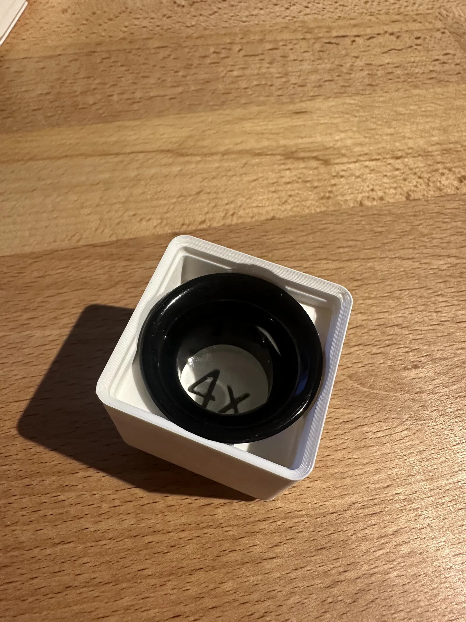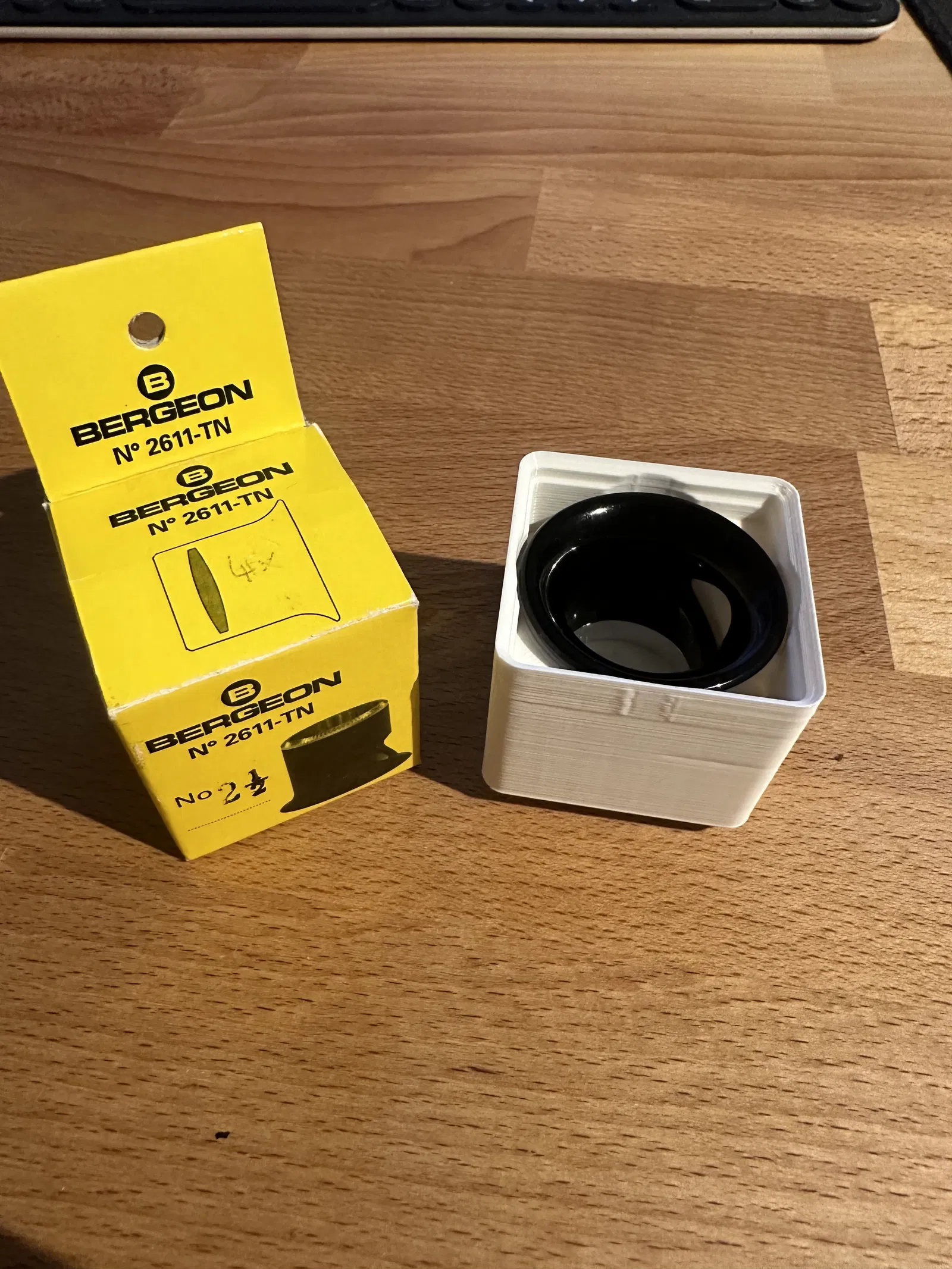 Cái đế Gridfinity 1x1 dành cho kính lúp Bergeon 2611-TN size 2 ½ 4x. Nó có sẵn một cái kính lúp 4x xịn sò ở dưới đáy, giúp bạn có thể nhìn rõ mọi thứ ngay cả khi không cần lấy ra. Tương thích 100% với Gridfinity.