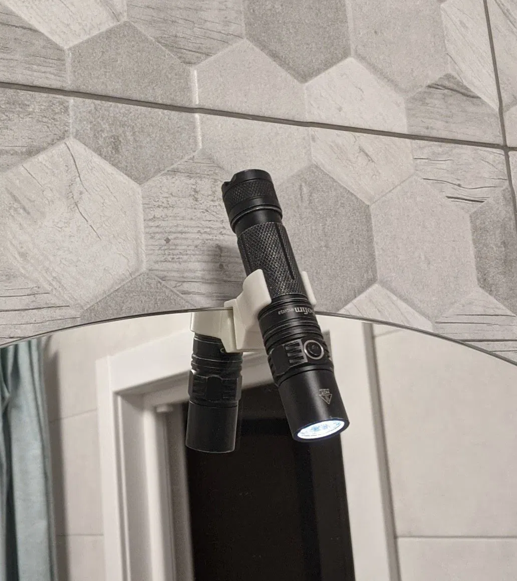 Cái đế này giúp bạn gắn đèn pin lên kiếng phòng tắm, rất tiện lợi. Tui chế lúc bị cúp điện ở Ukraine năm ngoái, cần 1 con ốc M3 với đai ốc để xài.