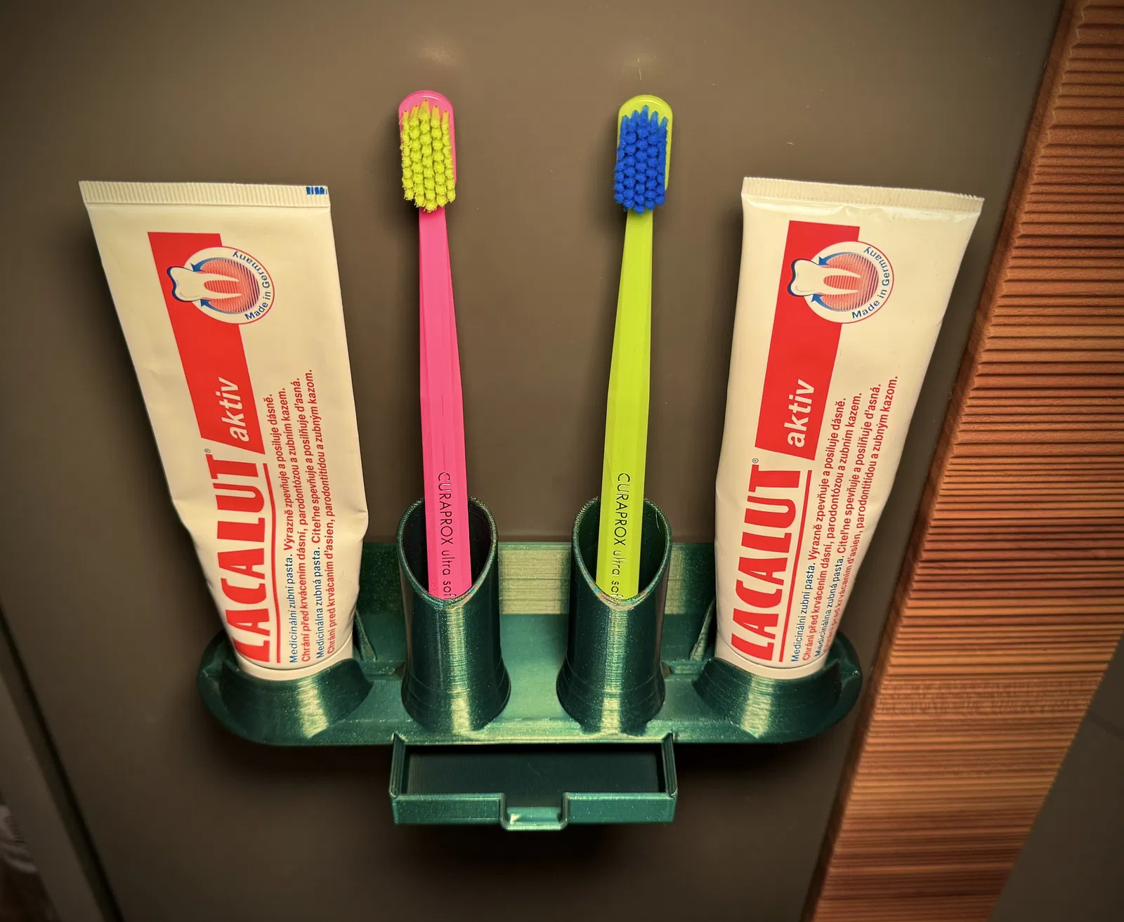 Kệ với ngăn kéo để nước nhỏ giọt từ bàn chải và lỗ để vắt kem đánh răng.