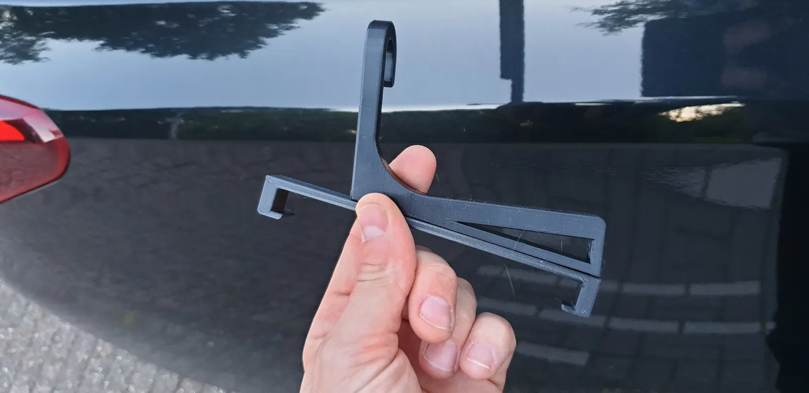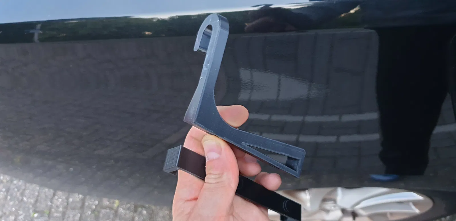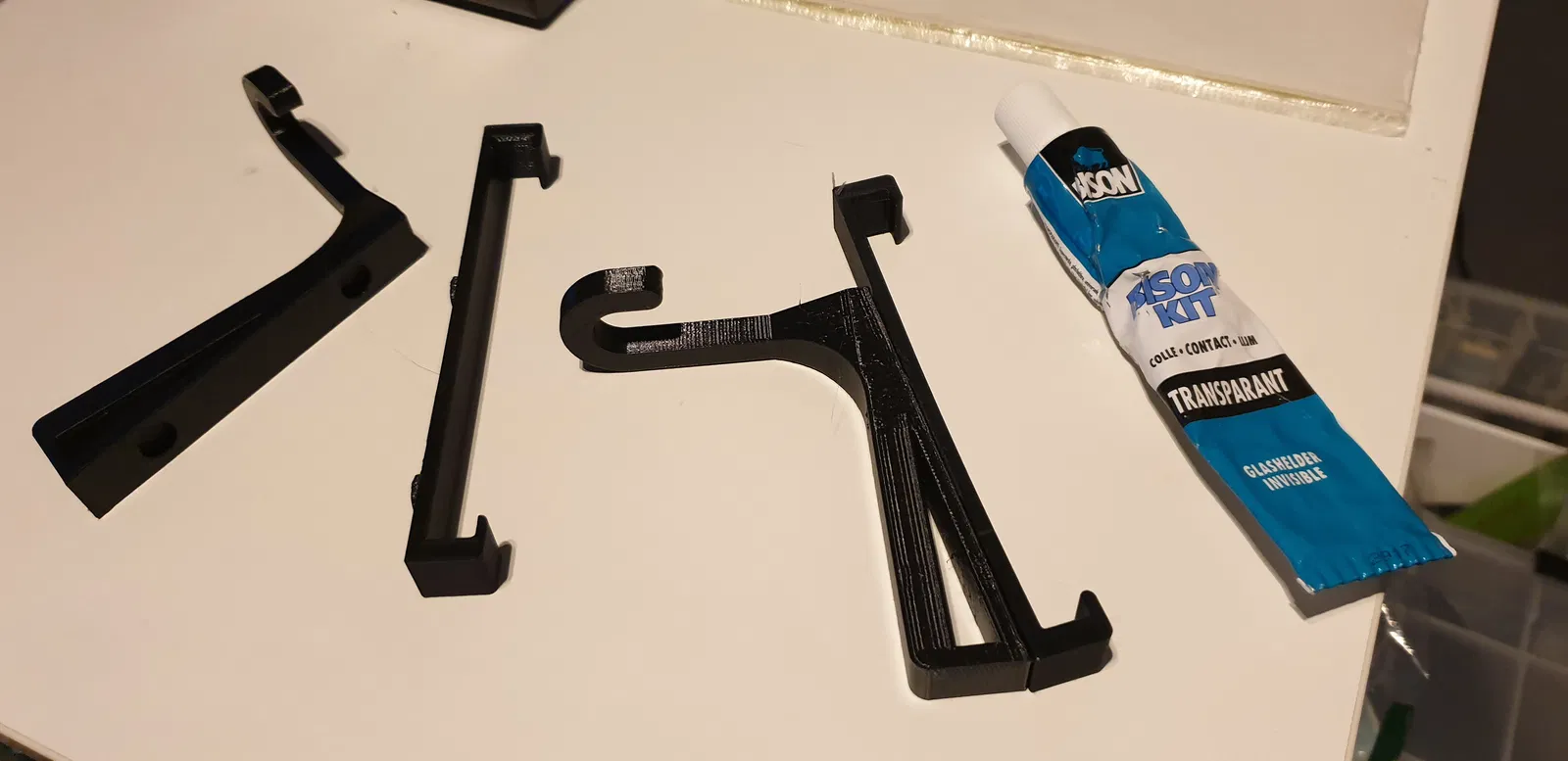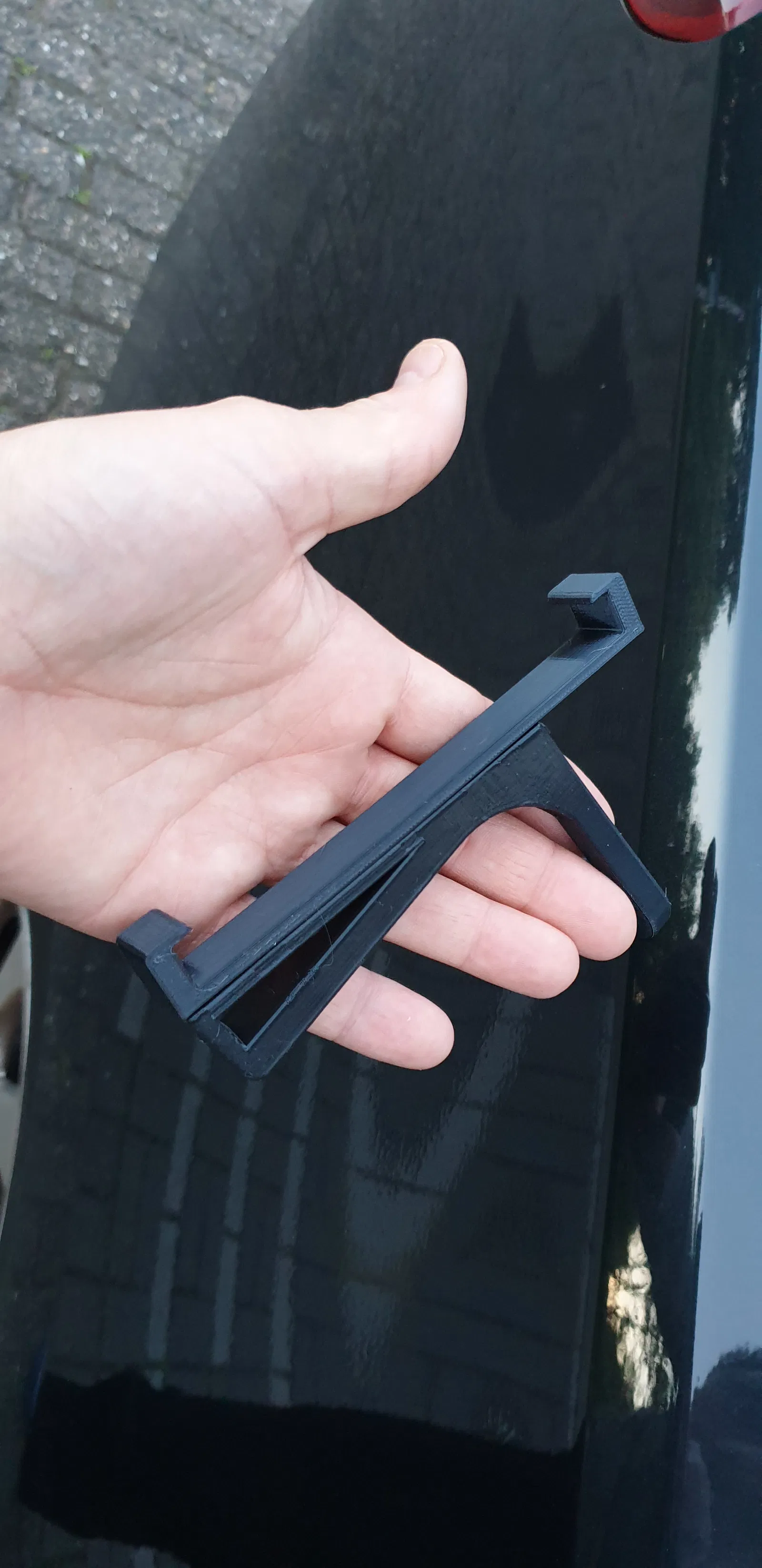 In cái móc "thẳng đứng" vì nó sẽ thẳng đứng trong xe. Như vậy đường in sẽ rất chắc. In phần giữ máy tính bảng nằm ngang. Khi mày dán hai phần lại với nhau, hai cái sẽ cứng cáp hơn vì đường in của chúng vuông góc với nhau.