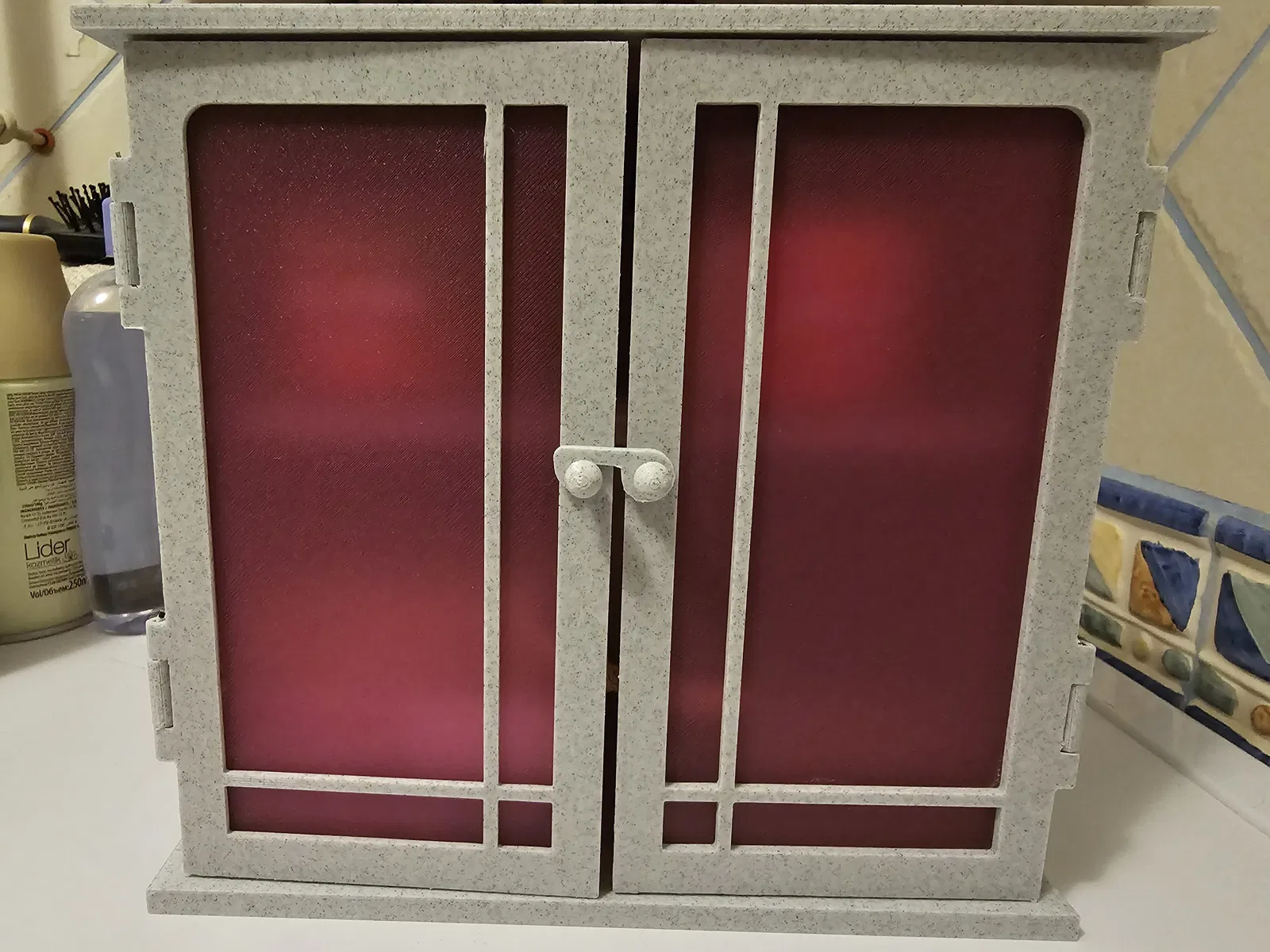 Tủ phòng tắm nhỏ (194 cao x 178 rộng x 83 sâu) với mặt sau cửa trong suốt giống kính mờ. Dễ in, không cần hỗ trợ, chỉ cần brim cho một số bộ phận. Có thể in bằng PLA hoặc PETG. Dùng PETG cho mặt sau cửa để tạo hiệu ứng kính mờ đẹp mắt.