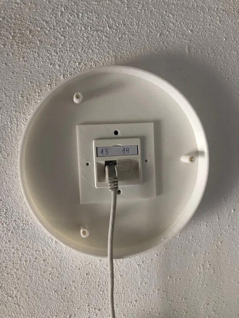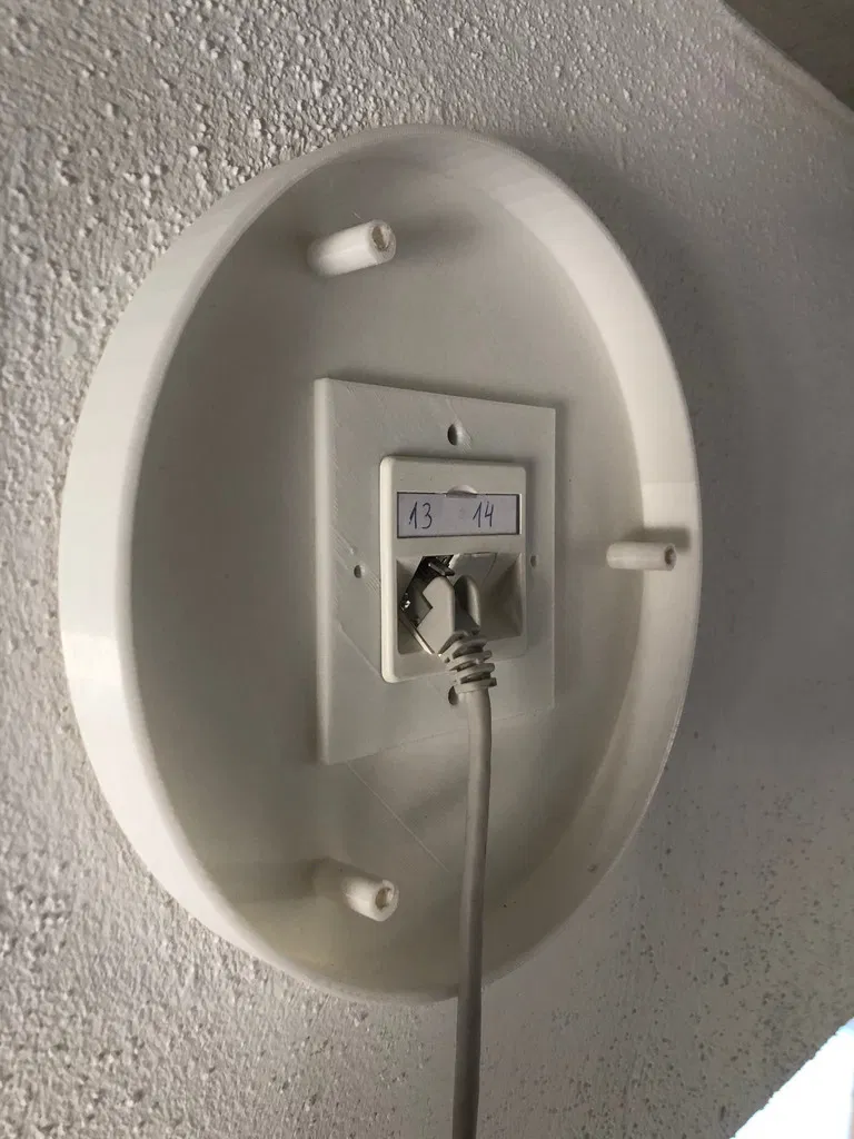 Wird anstatt eines Rahmen für eine Unterputzdose montiert. die Innere Blende/Abdeckung für die RJ45-Anschlüsse hält das gedruckte Rahmenteil. Das Netzwerkkabel zum Anschluss des APs verschwindet komplett im gedruckten Gehäuse.