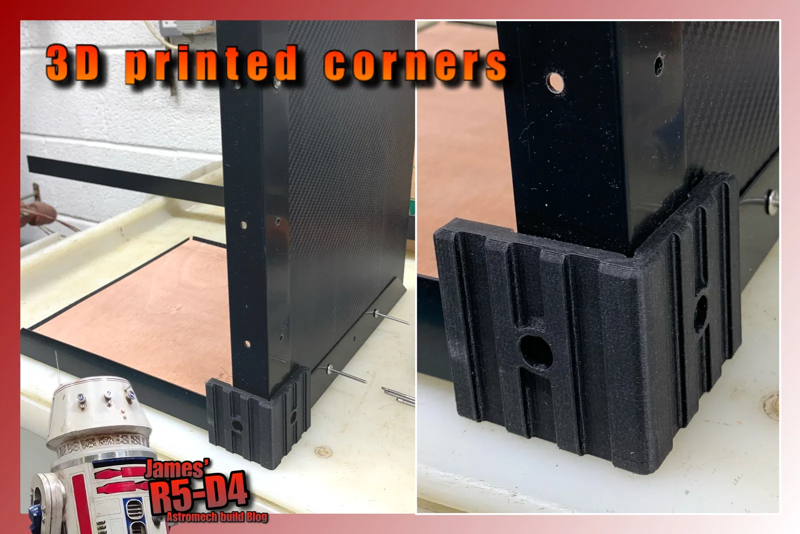 Không cần nó nặng hay quá chắc chắn, chỉ cần nó chống được va đập thôi. Nên tui lôi ra mấy tấm gỗ [3mm], mua mấy cái góc nhựa 90 độ & vài miếng decal giả carbon fiber. Tui khoét mấy cái góc này để lắp vừa mấy cạnh nhựa. Sau đó đóng đinh tán lại hết. Nếu bạn dùng gỗ dày hơn thì có thể dùng vít để cố định mấy cái này.