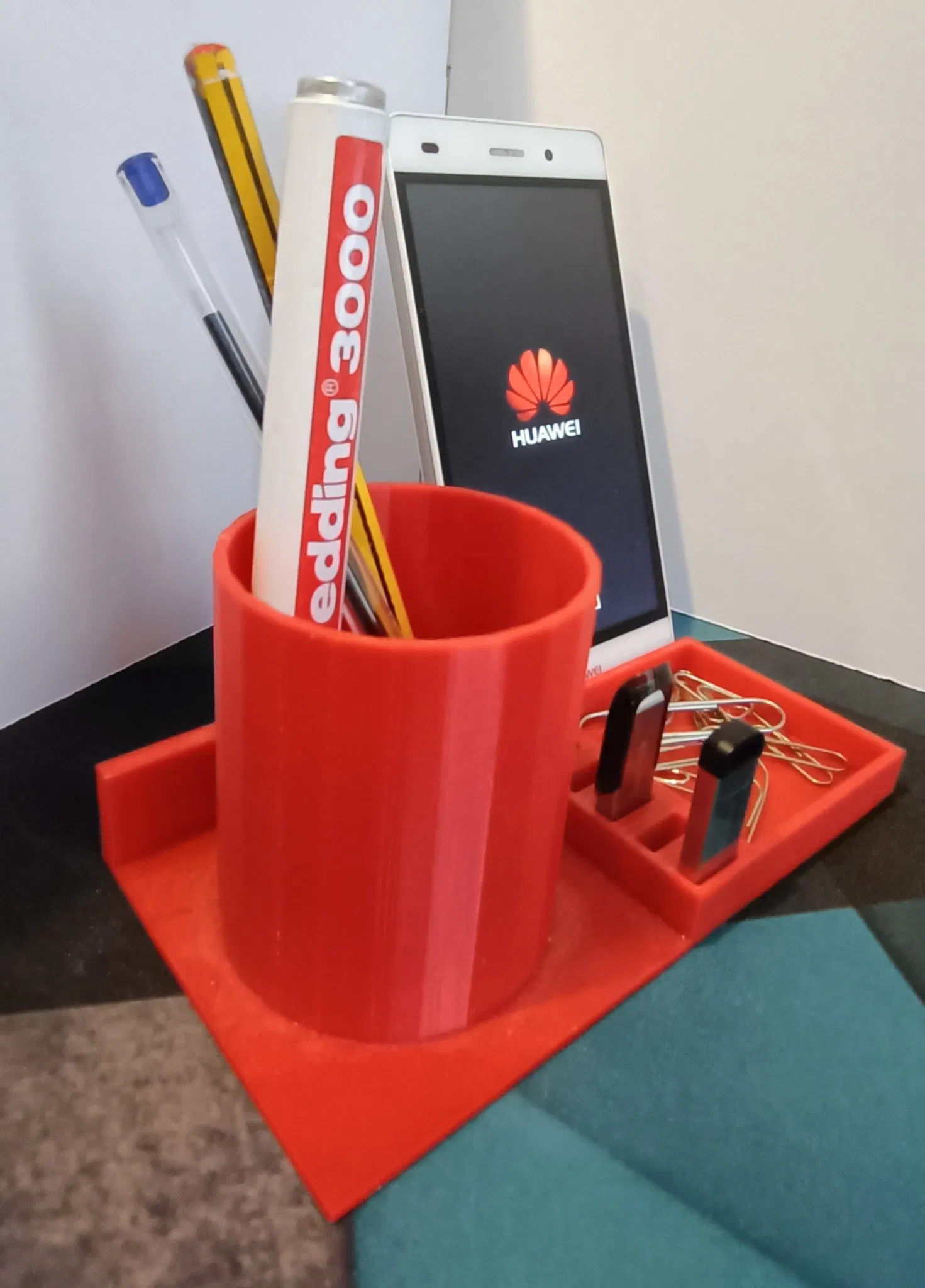 Tổ chức bàn cho bút chì, bút, clip, post-it và chủ di động. Tất cả trong một.