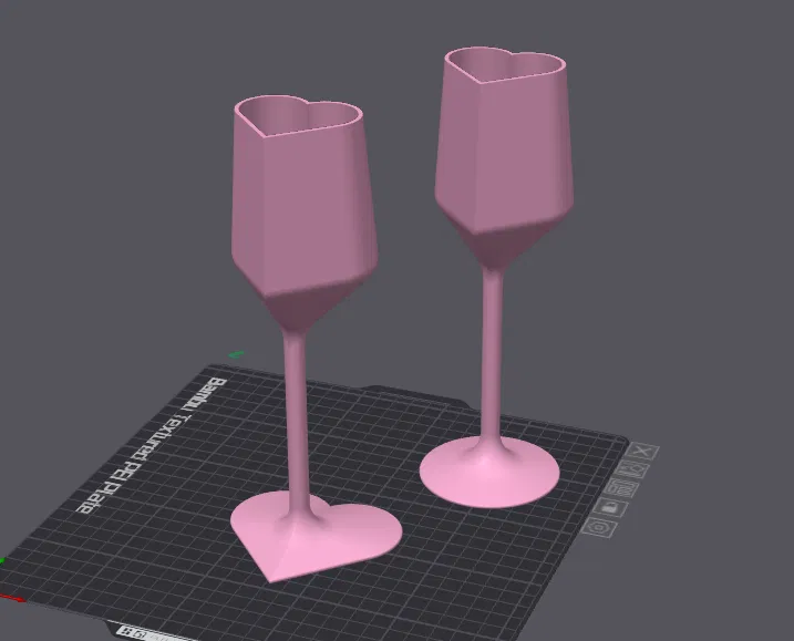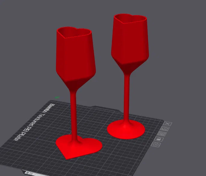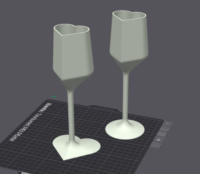 Ly sâm panh/flute hình trái tim. Có hai phiên bản với đế tròn hoặc hình trái tim. Cả hai ly đều có hình trái tim. Mô hình có kích thước thật, nhưng mô hình này được lấy cảm hứng và dùng cho bữa tiệc Valen-tiny cho các bé nhà tôi. Tôi đã in chúng ở mức 50% và các bé rất thích.