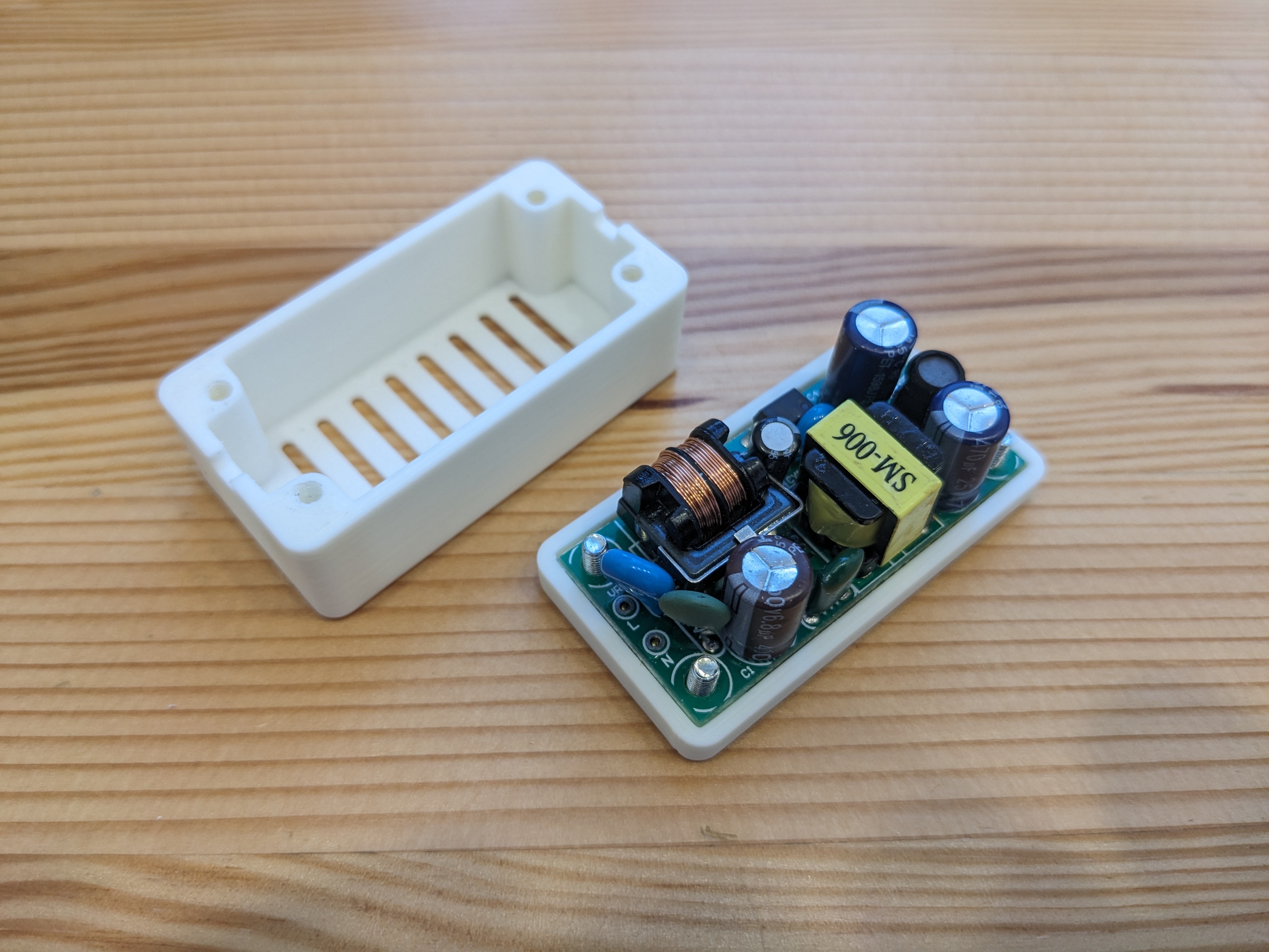 Hộp đựng bo mạch nguồn đơn giản, mua từ Aliexpress. Case được giữ cố định bằng 4 con ốc M3x10, vặn trực tiếp vào nhựa. Có thể cần làm ren lại lỗ nhựa nếu khớp quá chặt. Bản in không cần hỗ trợ.