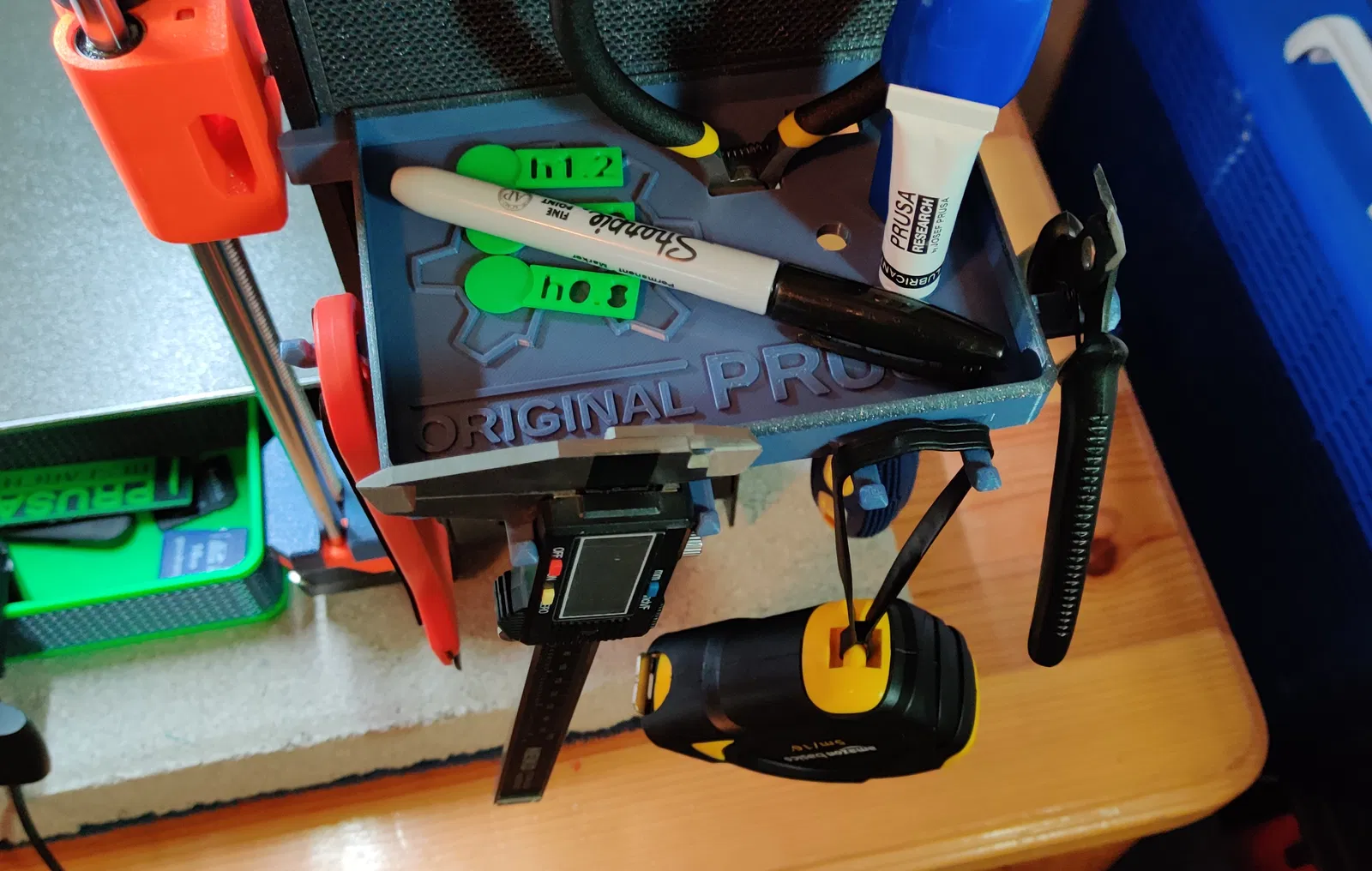 To hơn và Tốt hơn. Giờ có chỗ cho nhiều đồ nghề hơn nữa! Cái này cân được hết mọi thứ bạn bỏ vào! Nhiều cải tiến trên mẫu lắm đó. CHÚC VUI VẺ NHÉ! Cái rổ phía sau to hơn, kẹp gắn vô khung được cải tiến (không bị xệ), có và không có logo, chỗ để lục giác xịn hơn, mấy cái móc được nâng lên và đặt ở vị trí tốt hơn, thêm nhiều ô nhỏ cho rổ, thêm nhiều lỗ với kích cỡ khác nhau, hai cái khe hình chữ nhật, được thiết kế thành một khối duy nhất, Gcode có làm mịn mặt trên (top ironing), và thêm vài cải tiến nữa. Đây là Hộp Đựng Đồ Nghề Tối Thượng V3 của tui cho Prusa MK3S. Bạn có thể sở hữu Hộp Đựng Đồ Nghề Tối Thượng V3 này với giá chỉ một Lượt Thích! Cảm ơn nhiều và Chúc vui, cho tui thấy mấy tấm hình nha và cho tui biết bạn thích nó cỡ nào! Đây là một bản in khó đó (có 2 lần đổi sợi)! Nhớ là mặt bàn in phải sạch và lớp đầu tiên PHẢI KHÍT và sẵn sàng để in! Hai lần đổi sợi và các bộ điều chỉnh infill tạo nên cái hoa văn đa dạng cho nó đó. Cái kẹp thì gắn bên trái trước rồi kéo bên phải vô. Tôi đã 3D in được hai năm rồi và đã xây dựng một bộ sưu tập các dụng cụ tôi hay dùng. Trong này tôi sắp xếp gọn gàng, Tua vít bake Kềm cắt Thước kẹp Dao cạo nhựa Tuốc nơ vít lục giác 7mm Kềm Tuốc nơ vít lục giác 2.5mm 2x Dao rọc giấy Dụng cụ làm sạch 6x Dũa 2x Nhíp Bàn chải kim loại 6x lục giác 3x Dụng cụ làm sạch có lưỡi Mỡ bôi trơn Thước dây Và còn chỗ cho nhiều thứ khác nữa. Cái khay này có kích thước rất rộng rãi cho hầu hết mọi thứ bạn muốn. Cái Hộp Đựng Đồ Nghề đã được làm to hơn để chứa được nhiều đồ nghề hơn. Phần đế gốc của mẫu là của argoroots. https://www.f3d.vn/profile/argoroots_42675 ### Hướng dẫn in Đây là một bản in khó (có đổi sợi)! Nhớ là mặt bàn in phải sạch và lớp đầu tiên PHẢI KHÍT và sẵn sàng để in! Tôi đã in bằng PLA trên tấm PEI Texture của mình. Nó sử dụng việc đổi sợi và các bộ điều chỉnh trên hoa văn infill lộ ra. Bạn cần có một mặt bàn in thật sạch, các cái móc giờ được nâng lên làm cho bản in ít bị cong vênh hơn. Nếu bạn chỉnh sửa mẫu thì bạn sẽ phải làm lại việc đổi sợi và các bộ điều chỉnh infill. Việc này dễ thôi nếu bạn xem kỹ file 3mf tôi đính kèm. Tôi sẽ đính kèm các file Blender để bạn có thể tùy chỉnh nếu muốn. Tôi đã đính kèm một phiên bản có logo và một phiên bản không có logo để có một cái khay trông sạch sẽ. Cảm ơn rất nhiều vì đã xem tác phẩm của tôi!