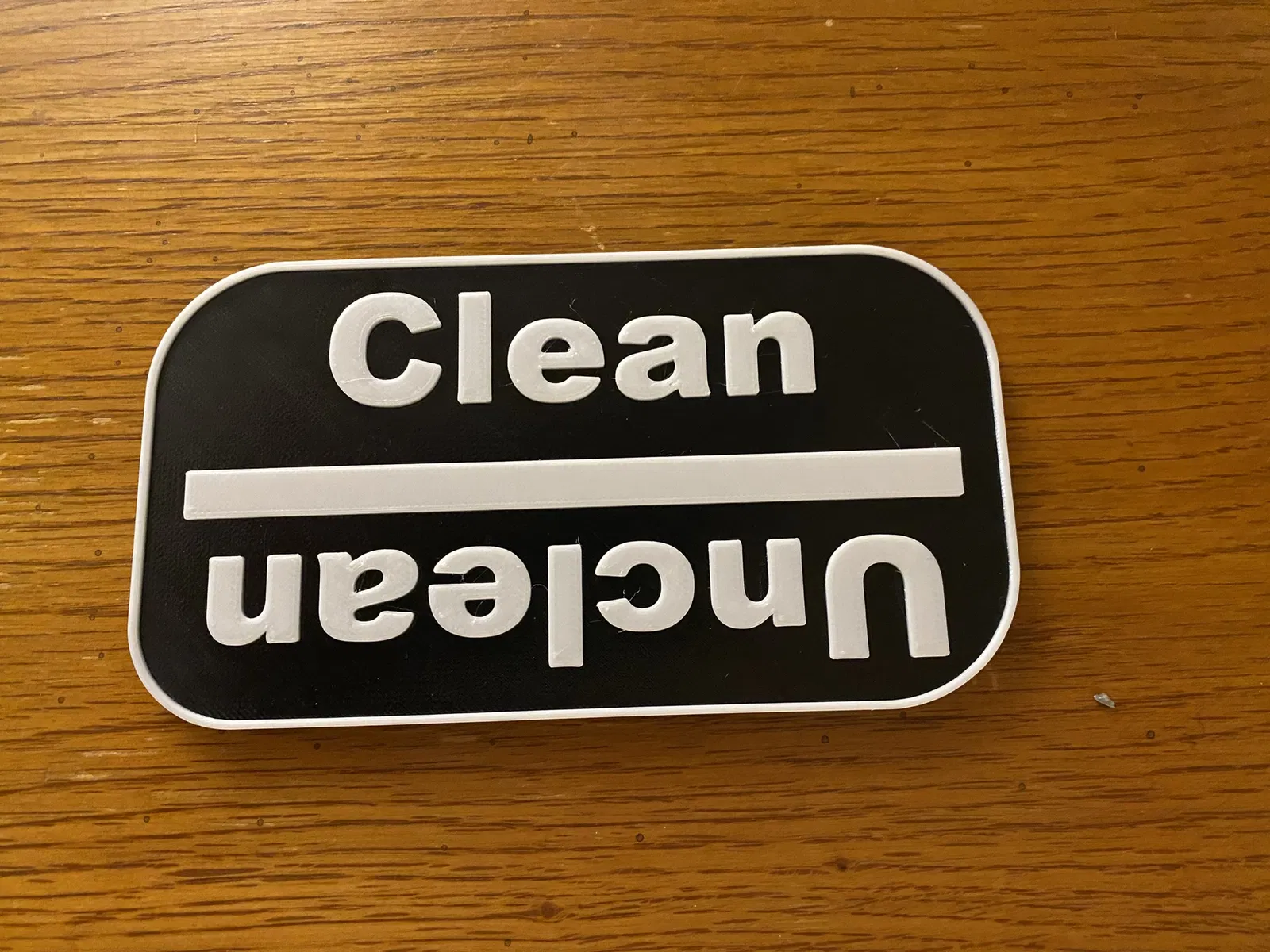 Chỉ là một cái nam châm máy rửa chén thôi, tui tự thiết kế cho vui đó mà. Bạn có thể đổi màu để chữ và viền khác màu với nền. Phía sau có lỗ để nhét nam châm 9x2mm, dính luôn khỏi cần keo.