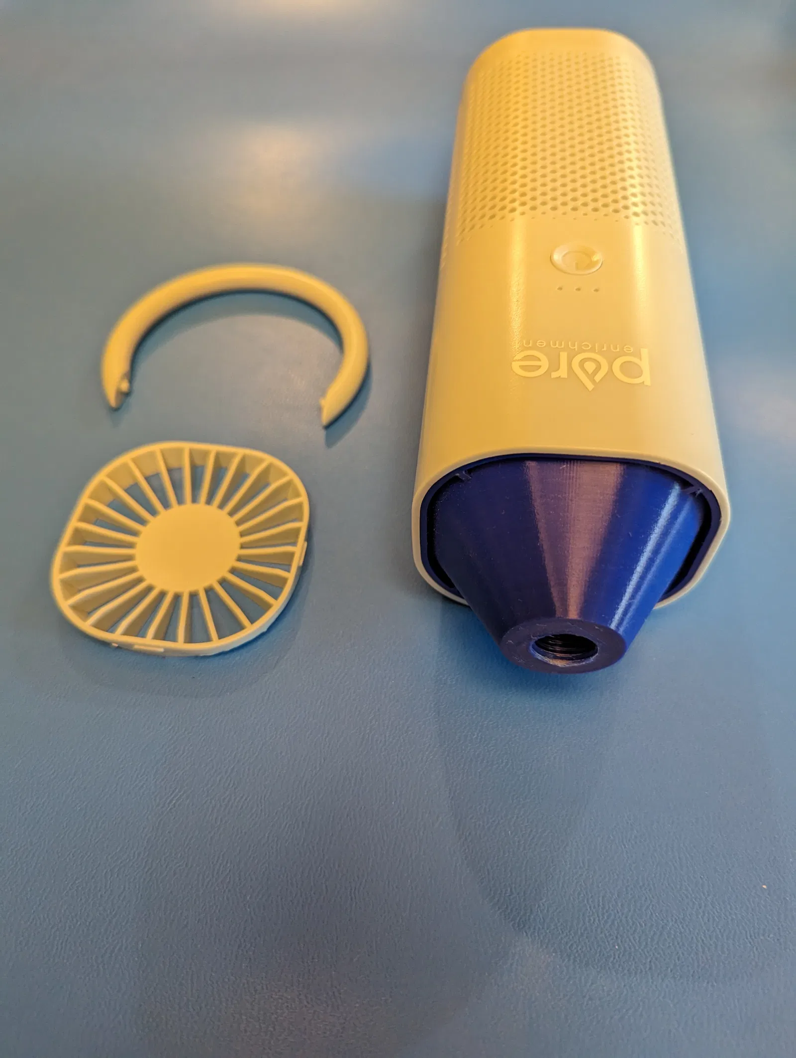 Cái này gắn vô cái lỗ thoát khí của lọc HEPA PureZone Mini, và tạo ra một giao diện ren xoắn 1/4 inch NPT. Bạn phải tự tạo ren NPT nha, vì trong mô hình chỉ có một cái lỗ hình nón để tiện cho việc tạo ren. Để lắp ráp, bạn phải tháo cái nắp quạt phía trên ra (tui khuyên dùng mấy cái miếng cạy đồ, pick đàn guitar, hay bất cứ cái gì mỏng mà đủ cứng để bẻ mấy cái lẫy ra khỏi rãnh của nó). Thiết kế này thay thế cái nắp quạt phía trên luôn.