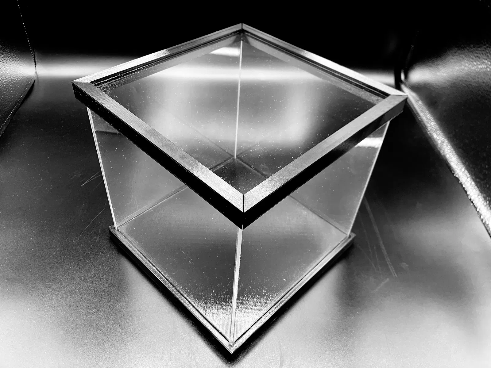 Tao làm cái hộp mica trưng bày cỡ 7" x 7" x 7" cho ba tao, thay cho cái hộp nhựa mỏng manh. Dùng PETG để in và keo E6000 để dán, các cạnh cắt 7" x 7" x 1/8", nóc cắt 7 3/16" x 7 3/16" x 1/8". Nắp cắt làm bốn phần cho dễ in.