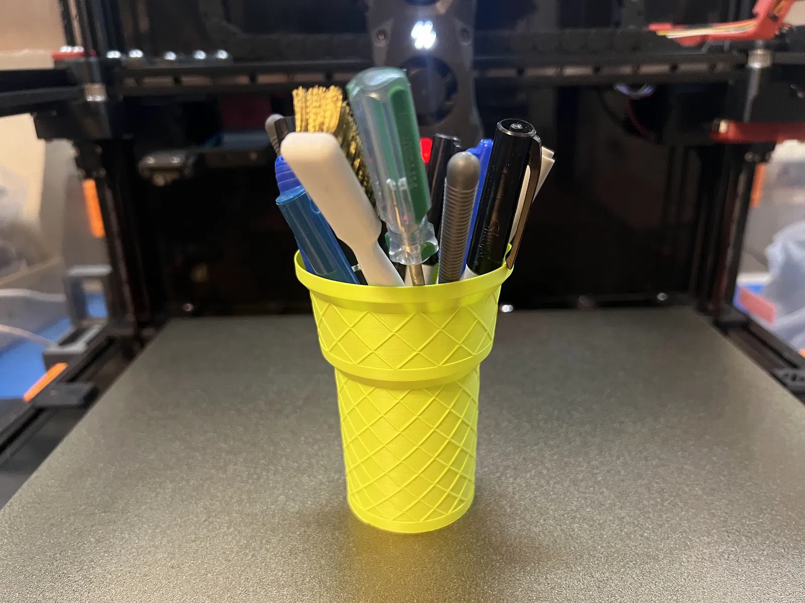 Một cái nón kem dễ thương, bạn có thể dùng để cắm hoa hoặc đựng bút viết. Chế độ in đặc biệt này sẽ tạo ra sản phẩm có hình xoắn ốc độc đáo, rất hợp để trang trí bàn làm việc hoặc làm quà tặng ý nghĩa. Thích hợp cho cả người mới bắt đầu tập tành in 3D.