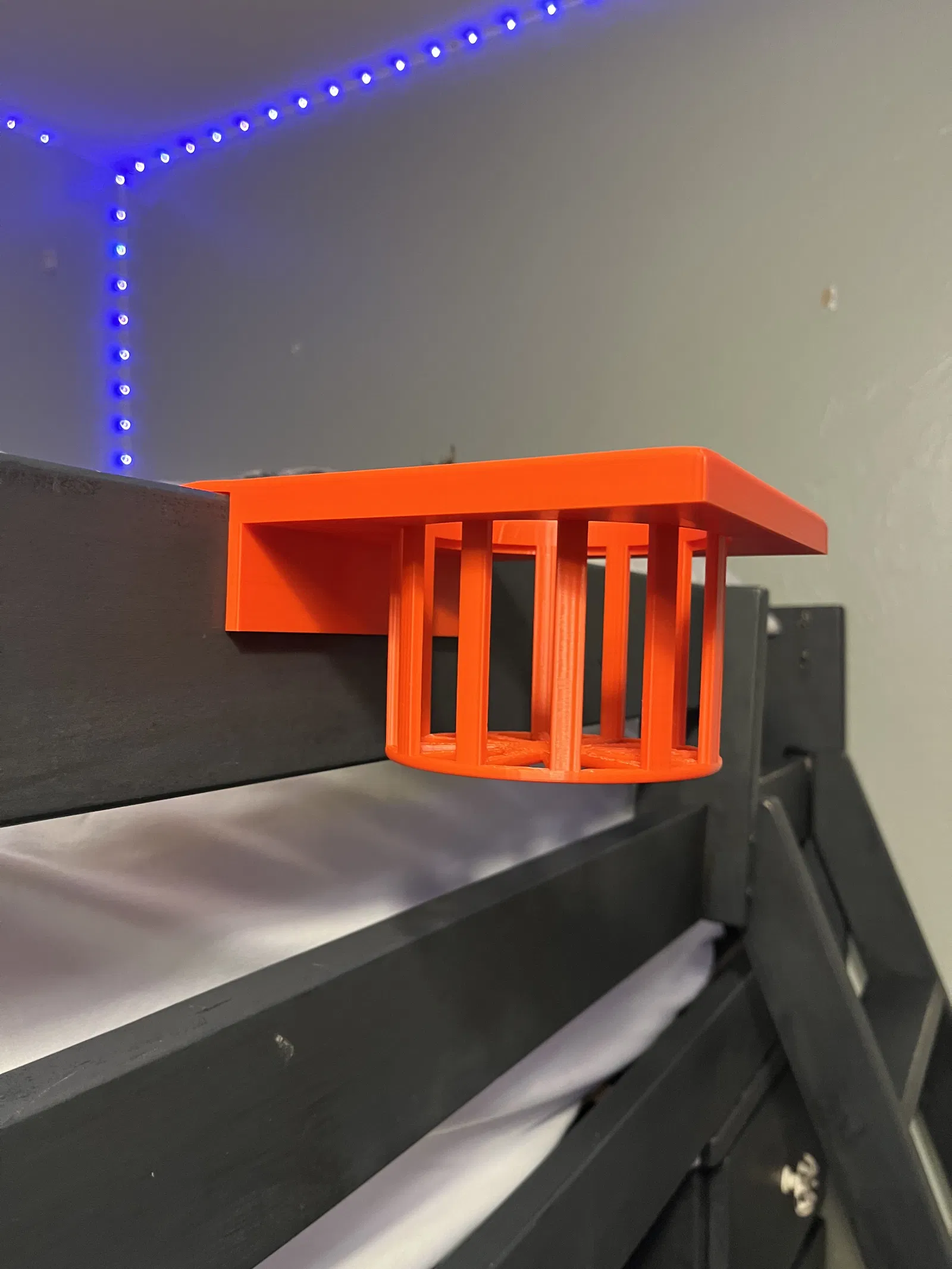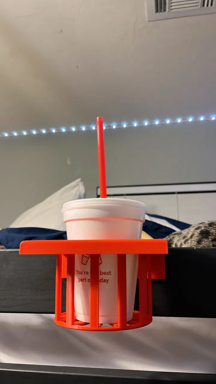 Con trai tôi tự thiết kế và in kệ ly giường tầng bằng PLA sau khi thấy cái cũ của bạn quá mỏng manh. Kệ được thiết kế chắc chắn, đo đạc kỹ lưỡng kích thước ly và thanh giường, phù hợp với thanh giường rộng 25.3mm. Có thể cần điều chỉnh kích thước cho phù hợp với giường của bạn.