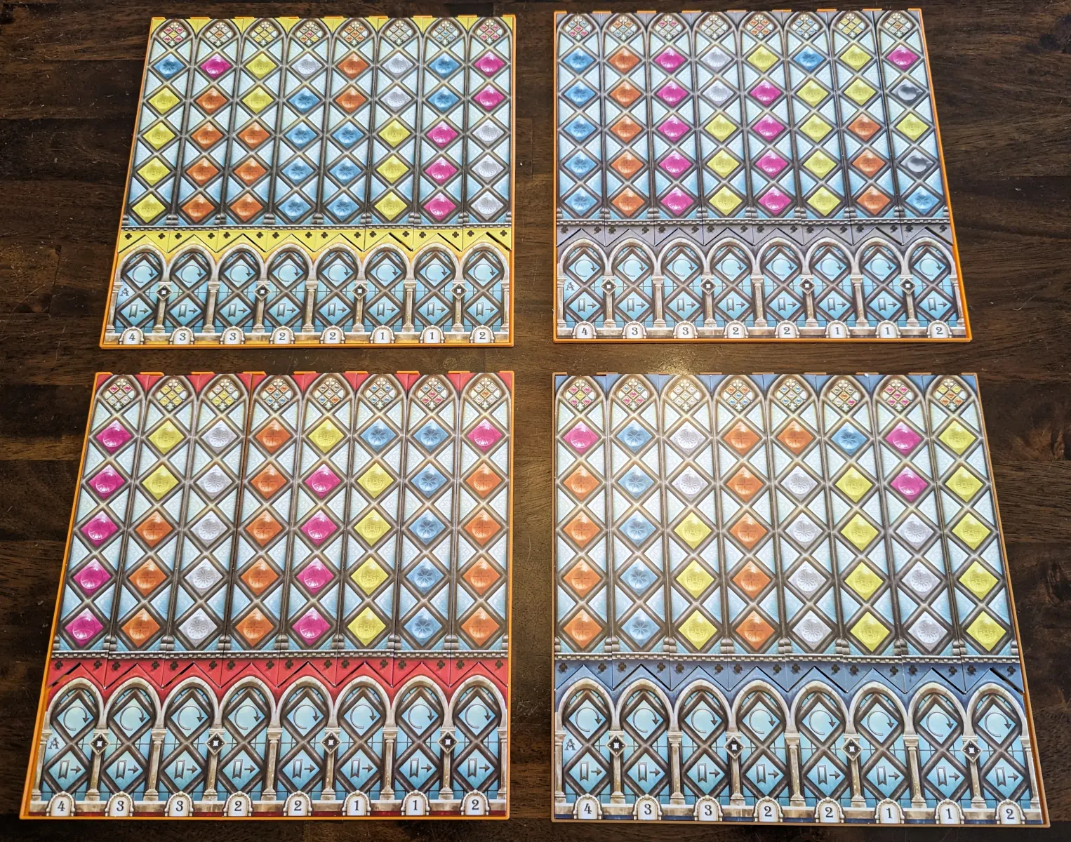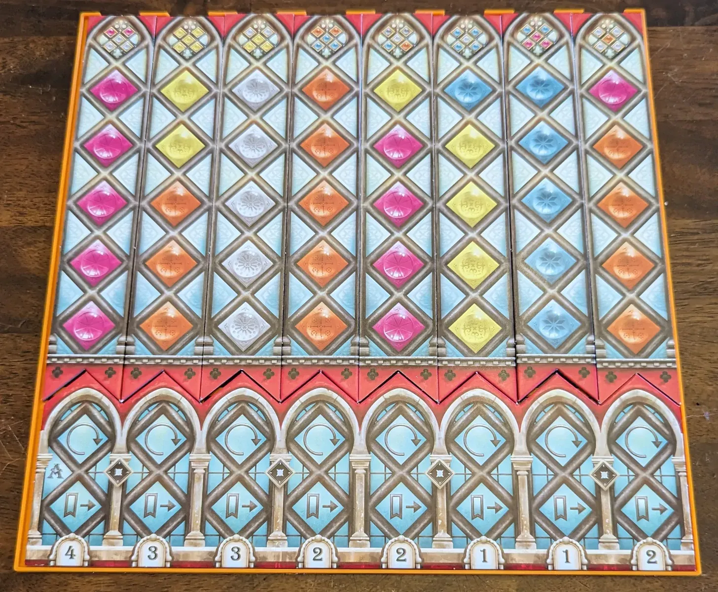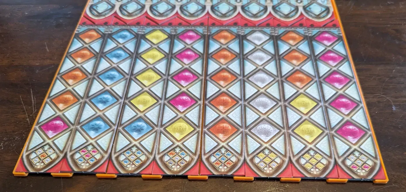 Khay đựng bài và dải hoa văn cho Azul: Kính Màu Sintra. Giúp mấy dải hoa văn không bị trượt, dễ dàng hơn khi chơi. Có code OpenSCAD để tùy chỉnh kích thước khoét lỗ và độ dày đáy khay.