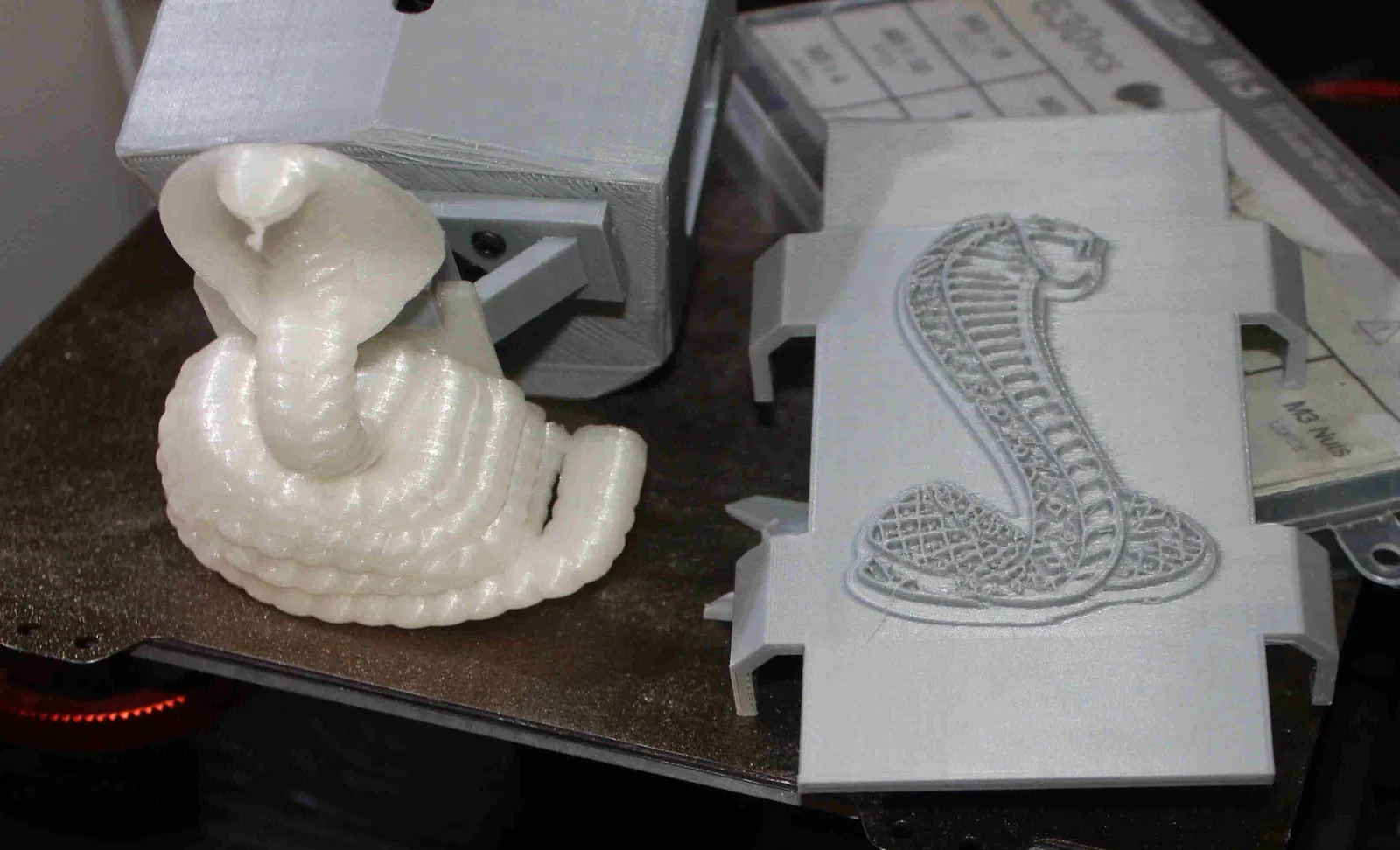 OK, cái này thì làm cho vui thôi. Tôi đã tạo một món đồ trang trí cho bộ phận dẫn nhựa (hotend enclosure) của máy in 3D Anycubic Kobra của tôi, lấy cảm hứng từ con rắn hổ mang (Cobra). Bản dựng này gồm 2 phần: con rắn và một cái giá đỡ. Đối với con rắn, tôi đã sử dụng sợi PLA phát quang trong tối của Amolen. Còn cái giá đỡ thì dùng PLA có màu trùng với bộ phận dẫn nhựa. Việc in con rắn khó hơn một chút vì sợi PLA phát quang trong tối cần nhiệt độ cao hơn và tốc độ chậm hơn để in đẹp, khoảng 40 mm/giây. Vì vậy, đối với nó, nhiệt độ đầu phun là 220 độ C và nhiệt độ bàn in là 75 độ C. Đối với giá đỡ, nhiệt độ đầu phun thông thường 195-200 độ C là ổn và nhiệt độ bàn in là 65 độ C. Để in món này, bạn cần dùng chế độ hỗ trợ (supports) và đặt con rắn nằm ngửa khi in. Tôi thấy mình cần phải điều chỉnh bước nhảy (estep) cho sợi Amolen vì nó không chảy mượt mà như PLA thông thường. Dường như nó có tính mài mòn cao hơn các loại sợi khác.