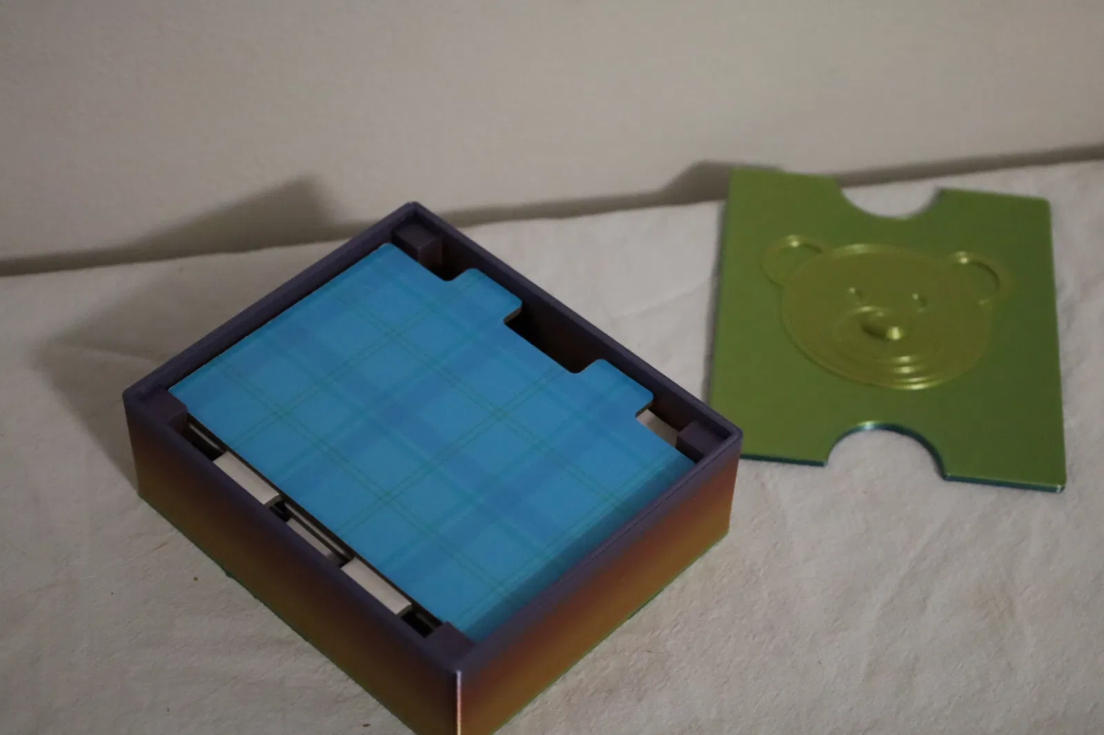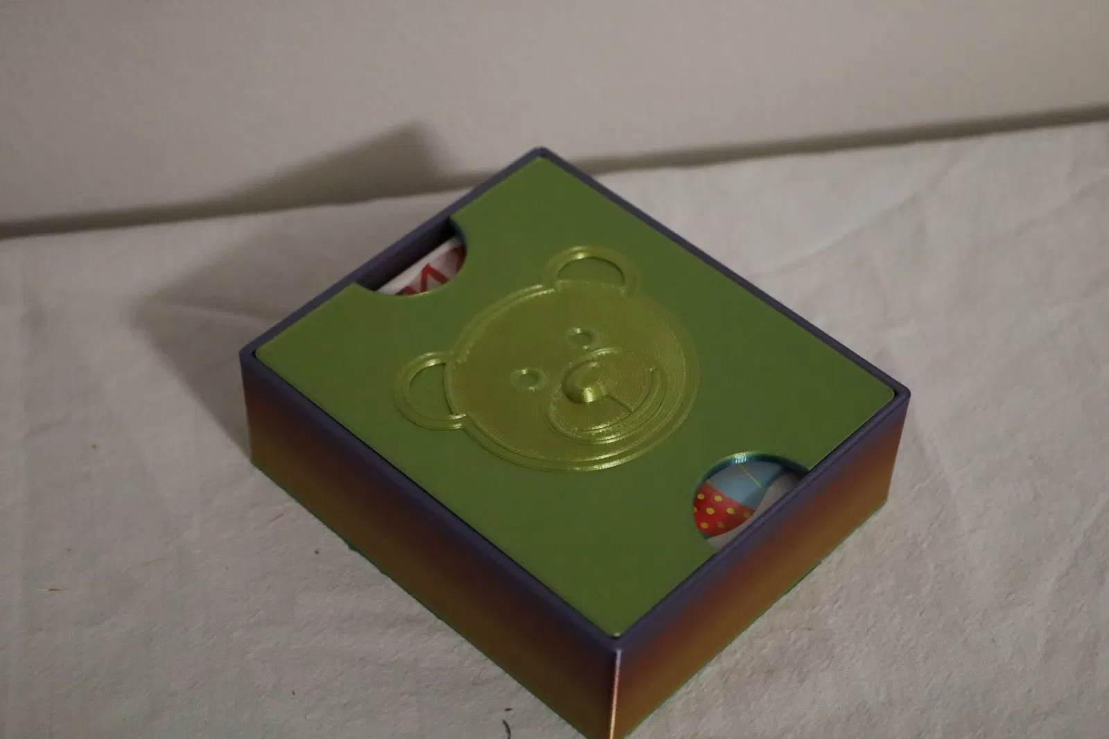 Hộp đơn giản để đựng các mảnh ghép hình lớn. Mặt trên có lỗ khoét ngón tay cái lớn để trẻ nhỏ dễ dàng mở và đóng. Có một chú gấu bông nhỏ trên nắp. Bạn có thể tùy chỉnh kích thước cho phù hợp.
