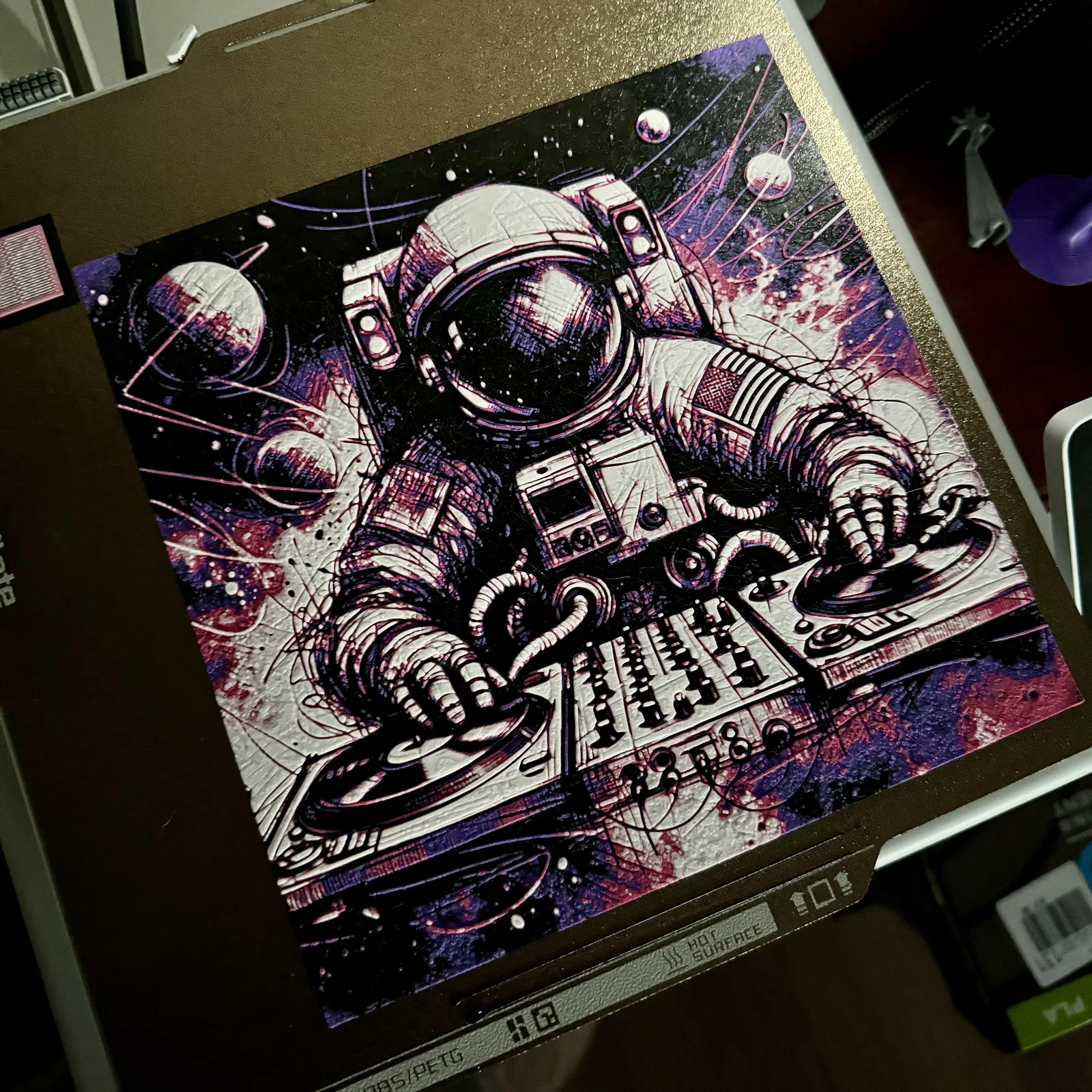 Tranh 2D DJ phi hành gia theo phong cách thập niên 90, in bằng PLA với các màu Black, Purple, Magenta và White. Thích hợp làm tranh tường hoặc quà tặng.