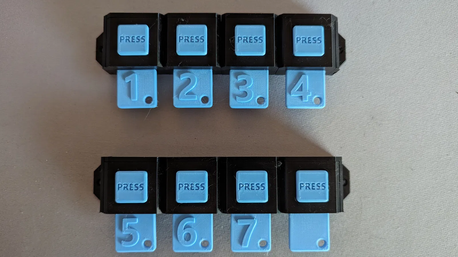 Tôi đã có thể in mọi thứ mà không cần hỗ trợ, mặc dù nút bấm được in với văn bản "press" hướng lên trên, tạo ra một cầu nối dài. Tôi đã có thể in cái này mà không cần hỗ trợ, nhưng nó không phải là bản in tốt nhất, bạn có thể thấy nó hoạt động tốt hơn với hỗ trợ.